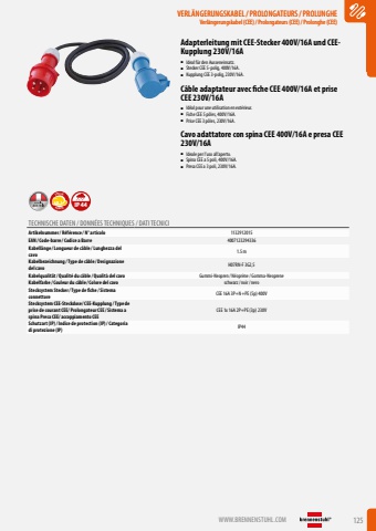 WWW.BRENNENSTUHL.COM 125VERL%u00c4NGERUNGSKABEL/PROLONGATEURS/PROLUNGHEVerl%u00e4ngerungskabel (CEE)/ Prolongateurs (CEE)/ Prolonghe (CEE)VERL%u00c4NGERUNGSKABEL/PROLONGATEURS/PROLUNGHEVerl%u00e4ngerungskabel (CEE)/ Prolongateurs (CEE)/ Prolonghe (CEE)Adapterleitung mit CEE-Stecker 400V/16A und CEEKupplung 230V/16A%u25a0 Ideal f%u00fcr den Ausseneinsatz.%u25a0 Stecker CEE 5-polig, 400V/16A.%u25a0 Kupplung CEE 3-polig, 230V/16A.C%u00e2ble adaptateur avec fiche CEE 400V/16A et prise CEE 230V/16A%u25a0 Id%u00e9al pour une utilisation en ext%u00e9rieur.%u25a0 Fiche CEE 5 p%u00f4les, 400V/16A.%u25a0 Prise CEE 3 p%u00f4les, 230V/16A.Cavo adattatore con spina CEE 400V/16A e presa CEE 230V/16A%u25a0 Ideale per l%u2019uso all%u2019aperto.%u25a0 Spina CEE a 5 poli, 400V/16A.%u25a0 Presa CEE a 3 poli, 230V/16A.ROBUSTSPECIALIP44TECHNISCHE DATEN / DONN%u00c9ES TECHNIQUES / DATI TECNICIArtikelnummer/ R%u00e9f%u00e9rence / N%u00b0 articolo 1132912015EAN/ Code-barre / Codice a Barre 4007123294336Kabell%u00e4nge / Longueur de c%u00e2ble / Lunghezza del cavo1.5 mKabelbezeichnung / Type de c%u00e2ble / Designazione del cavo H07RN-F 3G2,5Kabelqualit%u00e4t/ Qualit%u00e9 du c%u00e2ble / Qualit%u00e0 del cavo Gummi-Neopren / N%u00e9opr%u00e8ne/ Gomma-NeopreneKabelfarbe / Couleur du c%u00e2ble / Colore del cavo schwarz/ noir/ neroStecksystem Stecker/ Type de fiche / Sistema connettore CEE 16A 3P+N+PE (5p) 400VStecksystem CEE-Steckdose/ CEE-Kupplung / Type de prise de courant CEE/ Prolongateur CEE/ Sistema a spina Presa CEE/ accoppiamento CEECEE 1x 16A 2P+PE (3p) 230VSchutzart (IP)/ Indice de protection (IP)/ Categoria di protezione (IP) IP44