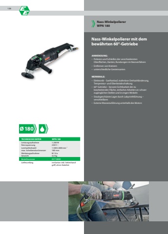 %u00d8180Nass-WinkelpoliererWPN 180Nass-Winkelpolierer mit dem bew%u00e4hrten 60%u00b0-GetriebeANWENDUNG:%u2013 Polieren und Schleifen der verschiedensten Oberfl%u00e4chen, Kanten, Rundungen im Nassverfahren%u2013 Entfernen von Kratzern%u2013 unterschiedliche GesteinsartenMERKMALE:%u2013 Elektronik %u2013 Sanftanlauf, stufenlose Drehzahl%u00e4nderung, Temperatur- und %u00dcberlastabschaltung%u2013 60%u00b0-Getriebe %u2013 bessere Sichtbarkeit der zu bearbeitenden Fl%u00e4che, einfaches Arbeiten an schwer zug%u00e4nglichen Stellen und in engen Winkeln%u2013 Staubgesch%u00fctzte Lager durch Labyrinthf%u00fchrung %u2013 verschlei%u00dfarm%u2013 Externe Wasserzuf%u00fchrung unterhalb des MotorsTECHNISCHE DATEN WPN 180Leistungsaufnahme 1.200 WNennspannung 230 V ~Leerlaufdrehzahl 1.500-2.800 min-1max. Scheibendurchmesser 180 mmWerkzeugaufnahme M 14 aGewicht 4,4 kgBestellnummer 05710000Lieferumfang im Karton inkl. Seitenhandgriff, ohne Zubeh%u00f6r126