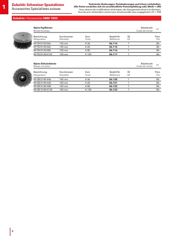 Technische %u00c4nderungen. Preis%u00e4nderungen und Irrtum vorbehalten.Alle Preise verstehen sich als unverbindliche Preisempfehlung exkl. MwSt + vRGSous r%u00e9serve de modifications techniques, de changements de prix et d%u2019erreurs. Tous les prix s%u2018entendent comme prix recommand%u00e9s sans engagement, HT + TAR81Zubeh%u00f6r Schweizer SpezialistenAccessoires Sp%u00e9cialistes suissesZubeh%u00f6r / Accessoires HBM 1002Nylon-Topfb%u00fcrsteBrosse boisseauRabattcodeCode de remise11BezeichnungD%u00e9signationDurchmesserDiam%u00e8treKornGrainBestell-Nr.R%u00e9f%u00e9renceVEUEPreis PrixNY-TB D130 K46130 mmK 4606.114138.%u2013NY-TB D130 K60130 mmK 6006.115138.%u2013NY-TB D130 K80130 mmK 8006.116138.%u2013NY-TB D130 K120130 mmK 12006.117138.%u2013Nylon-Zirkularb%u00fcrsteBrosse circulaireRabattcodeCode de remise11BezeichnungD%u00e9signationDurchmesserDiam%u00e8treKornGrainBestell-Nr.R%u00e9f%u00e9renceVEUEPreis PrixNY-ZB D140 K46140 mmK 4606.120158.%u2013NY-ZB D140 K60140 mmK 6006.121158.%u2013NY-ZB D140 K80140 mmK 8006.122158.%u2013NY-ZB D140 K120140 mmK 12006.123158.%u2013
