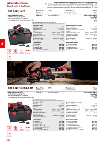 Technische %u00c4nderungen. Preis%u00e4nderungen und Irrtum vorbehalten.Alle Preise verstehen sich als unverbindliche Preisempfehlung exkl. MwSt + vRGSous r%u00e9serve de modifications techniques, de changements de prix et d%u2019erreurs. Tous les prix s%u2018entendent comme prix recommand%u00e9s sans engagement, HT + TAR10WinkelschleiferMeuleses d%u2018angle2Technische DatenLeistungsaufnahme900 WLeistungsabgabe600 WSpannung230 VFrequenz50/60 HzMax. Scheibendurchmesser125 mmLeerlaufdrehzahl11%u2018500 1/minWerkzeugaufnahmeM14Kabell%u00e4nge4.0 mAbmessung LxBxH300 x 75 x 105 mmGewicht2.0 kgLieferumfang1x Schutzhaube Schleifen436.8601x Spannflansch335.2821x Spannmutter M14100.0801x Stirnlochschl%u00fcssel, BL 5100.1101x Handgriff450.774Caract%u00e9ristiques techniquesPuissance absorb%u00e9e900 WPuissance utile600 WTension230 VFr%u00e9quence50/60 HzDiam%u00e8tre de disque max.125 mmVitesse de rotation %u00e0 vide11%u2018500 tr/minEmmanchementM14Longueur de c%u00e2ble4.0 mDimension LxlxH300 x 75 x 105 mmPoids2.0 kgEquipement de base1x carter de protection du pon%u00e7age436.8601x bride de serrage335.2821x ecrou de serrage M14100.0801x cl%u00e9 %u00e0 ergots, BL 5100.1101x poign%u00e9e450.774L 9-11 125Bestell-Nr.R%u00e9f%u00e9renceGTINRabattcodeCode de remisePreisPrix900 Watt Winkelschleifer, 125 mmMeuleuse d%u2018angle 900 Watt, 125 mm492.53140302932228921140.%u2013 exkl. MwSt. hors TVA 0.56 vRGTARTechnische DatenLeistungsaufnahme900 WLeistungsabgabe600 WSpannung230 VFrequenz50/60 HzMax. Scheibendurchmesser125 mmLeerlaufdrehzahl6%u2018000 %u2013 11%u2018500 1/minWerkzeugaufnahmeM14Kabell%u00e4nge4.0 mAbmessung LxBxH300 x 75 x 105 mmGewicht2.0 kgLieferumfang1x Schutzhaube Schleifen436.8601x Spannflansch335.2821x Spannmutter M14100.0801x Stirnlochschl%u00fcssel, BL 5100.1101x Handgriff450.774Caract%u00e9ristiques techniquesPuissance absorb%u00e9e900 WPuissance utile600 WTension230 VFr%u00e9quence50/60 HzDiam%u00e8tre de disque max.125 mmVitesse de rotation %u00e0 vide11%u2018500 tr/minEmmanchementM14Longueur de c%u00e2ble4.0 mDimension LxlxH300 x 75 x 105 mmPoids2.0 kgEquipement de base1x carter de protection du pon%u00e7age436.8601x bride de serrage335.2821x ecrou de serrage M14100.0801x cl%u00e9 %u00e0 ergots, BL 5100.1101x poign%u00e9e450.774LE 9-11 125Bestell-Nr.R%u00e9f%u00e9renceGTINRabattcodeCode de remisePreisPrix900 Watt Winkelschleifer mit variabler Drehzahl, 125 mmMeuleuse d%u2018angle 900 Watt,usage universel, 125 mm436.29140302931891331165.%u2013 exkl. MwSt. hors TVA 0.56 vRGTARTechnische DatenLeistungsaufnahme900 WLeistungsabgabe600 WSpannung230 VFrequenz50/60 HzMax. Scheibendurchmesser125 mmLeerlaufdrehzahl11%u2018500 1/minWerkzeugaufnahmeM14Kabell%u00e4nge4.0 mAbmessung LxBxH300 x 75 x 105 mmGewicht2.0 kgLieferumfang1x Schutzhaube Schleifen436.8601x Spannflansch335.2821x Spannmutter M14100.0801x Stirnlochschl%u00fcssel, BL 5100.1101x Handgriff450.7741x Koffereinlage414.2041x Transportkoffer L-BOXX%u00ae414.085Caract%u00e9ristiques techniquesPuissance absorb%u00e9e900 WPuissance utile600 WTension230 VFr%u00e9quence50/60 HzDiam%u00e8tre de disque max.125 mmVitesse de rotation %u00e0 vide11%u2018500 tr/minEmmanchementM14Longueur de c%u00e2ble4.0 mDimension LxlxH300 x 75 x 105 mmPoids2.0 kgEquipement de base1x carter de protection du pon%u00e7age436.8601x bride de serrage335.2821x ecrou de serrage M14100.0801x cl%u00e9 %u00e0 ergots, BL 5100.1101x poign%u00e9e450.7741x insert pour coffret414.2041x coffret de transport L-BOXX%u00ae414.085LE 9-11 125 L-BOXXBestell-Nr.R%u00e9f%u00e9renceGTINRabattcodeCode de remisePreisPrix900 Watt Winkelschleifer mit variabler Drehzahl, 125 mmMeuleuse d%u2018angle 900 Watt,usage universel, 125 mm436.73940302931895081215.%u2013 exkl. MwSt. hors TVA 0.56 vRGTAR