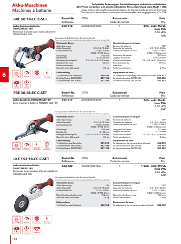 Technische %u00c4nderungen. Preis%u00e4nderungen und Irrtum vorbehalten.Alle Preise verstehen sich als unverbindliche Preisempfehlung exkl. MwSt + vRGSous r%u00e9serve de modifications techniques, de changements de prix et d%u2019erreurs. Tous les prix s%u2018entendent comme prix recommand%u00e9s sans engagement, HT + TAR16Zubeh%u00f6r WinkelschleiferAccessoires Meuleses d%u2018angle2Schutzhauben / Carters de protectionSchutzhaube TrennenCarter de protection tron%u00e7onnageRabattcodeCode de remise2Schutzhaube zum Trennen mit neuem Aufnahme-System, verstellbar. Nicht kompatibel zu Vorg%u00e4ngeversionen.Passend f%u00fcr alle Neuger%u00e4te mit FLEX Bestell-Nr. 406.XXX.Capot de protection pour tron%u00e7onnage avec nouveau syst%u00e8me de fixation, r%u00e9glable. Non compatible avec les versions pr%u00e9c%u00e9dentes. Convient %u00e0 tous les nouveaux appareils avec la r%u00e9f%u00e9rence FLEX 406.XXX.BezeichnungD%u00e9signationDurchmesserDiam%u00e8treBestell-Nr.R%u00e9f%u00e9renceVEUEPreis PrixGU-C D125 48/C125 mm409.774152.%u2013Schutzhaube TrennenCarter de protection tron%u00e7onnageRabattcodeCode de remise2Schutzhaube zum Trennen, passend f%u00fcr L 21-6 / L 24-6 / L 26-6 230.Capot de protection tron%u00e7onnage, adapt%u00e9 aux L 21-6 / L 24-6 / L 26-6 230.BezeichnungD%u00e9signationDurchmesserDiam%u00e8treBestell-Nr.R%u00e9f%u00e9renceVEUEPreis PrixGU-C D230 64/C L 21-6 / L 24-6230 mm389.625192.%u2013Trennschutz-Haube ClipClip pour capot de protectionRabattcodeCode de remise2Schutzhaube zum Trennen mit neuem Clip-on Aufnahme System.L%u00e4sst sich werkzeuglos montieren inklusive Schnittstelle f%u00fcr Staubabsaugung.Capot de protection pour le tron%u00e7onnage avec nouveau syst%u00e8me de fixation Clip-on.Se monte sans outils, interface pour l%u2018aspiration des poussi%u00e8res incluse.BezeichnungD%u00e9signationDurchmesserDiam%u00e8treBestell-Nr.R%u00e9f%u00e9renceVEUEPreis PrixGU-C D76 clip76 mm534.106111.50Trennschutz-Haube ClipClip pour capot de protectionRabattcodeCode de remise2Schutzhaube zum Trennen mit neuem Clip-on Aufnahme System.L%u00e4sst sich werkzeuglos montieren inklusive Schnittstelle f%u00fcr Staubabsaugung.Capot de protection pour le tron%u00e7onnage avec nouveau syst%u00e8me de fixation Clip-on.Se monte sans outils, interface pour l%u2018aspiration des poussi%u00e8res incluse.BezeichnungD%u00e9signationDurchmesserDiam%u00e8treBestell-Nr.R%u00e9f%u00e9renceVEUEPreis PrixGU-C D115 clip115 mm534.107113.%u2013Trennschutz-Haube ClipClip pour capot de protectionRabattcodeCode de remise2Schutzhaube zum Trennen mit neuem Clip-on Aufnahme System.L%u00e4sst sich werkzeuglos montieren inklusive Schnittstelle f%u00fcr Staubabsaugung.Capot de protection pour le tron%u00e7onnage avec nouveau syst%u00e8me de fixation Clip-on.Se monte sans outils, interface pour l%u2018aspiration des poussi%u00e8res incluse.BezeichnungD%u00e9signationDurchmesserDiam%u00e8treF%u00fcr SchutzhaubePour capot de protectionBestell-Nr.R%u00e9f%u00e9renceVEUEPreis PrixGU-C D125 clip125 mm436.860534.108113.50NEWNEWNEW
