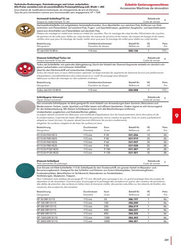 Technische %u00c4nderungen. Preis%u00e4nderungen und Irrtum vorbehalten.Alle Preise verstehen sich als unverbindliche Preisempfehlung exkl. MwSt + vRGSous r%u00e9serve de modifications techniques, de changements de prix et d%u2019erreurs. Tous les prix s%u2018entendent comme prix recommand%u00e9s sans engagement, HT + TAR455S%u00e4genSciesTechnische DatenLeistungsaufnahme850 WLeistungsabgabe850 WSpannung230 VFrequenz50/60 HzS%u00e4gebandl%u00e4nge1335 mmS%u00e4gebandbreite13 mmS%u00e4gebanddicke0.65 mmWinkelverstellung45%u00b0Schnittl%u00e4nge 90%u00b0100 mmSchnittbreite 90%u00b080 mmSchnittl%u00e4nge 45%u00b068 mmSchnittbreite 45%u00b055 mmKabell%u00e4nge4.0 mAbmessung LxBxH640 x 310 x 390 mmGewicht S%u00e4geb%u00fcgel7.9 kgGewicht18 kgLieferumfang1x Parallelanschlag385.2471x Bimetall-S%u00e4gebandCaract%u00e9ristiques techniquesPuissance absorb%u00e9e850 WPuissance utile850 WTension230 VFr%u00e9quence50/60 HzLongueur du ruban de scie1335 mmLargeur du ruban de scie13 mm%u00c9paisseur de ruban de scie0.65 mmR%u00e9glage angulaire45%u00b0Longueur de coupe 90%u00b0100 mmLargeur de coupe 90%u00b080 mmLongueur de coupe 45%u00b068 mmLargeur de coupe 45%u00b055 mmLongueur de c%u00e2ble4.0 mDimension LxlxH640 x 310 x 390 mmPoids archet de scie7.9 kgPoids18 kgEquipement de base1x but%u00e9e parall%u00e8le385.2471x ruban de scie bim%u00e9talliqueSBG 4910Bestell-Nr.R%u00e9f%u00e9renceGTINRabattcodeCode de remisePreisPrixMetall-Bands%u00e4ge mit schwenkbarem S%u00e4gerahmenScie %u00e0 ruban m%u00e9tallique avec b%u00e2ti pivotant390.51840302931631951625.%u2013 exkl. MwSt. hors TVA 5.56 vRGTARTechnische DatenLeistungsaufnahme1400 WLeistungsabgabe720 WSpannung230 VFrequenz50/60 HzMax. Leerlaufdrehzahl3%u2018800 1/minSchnitttiefe0 %u2013 63 mmS%u00e4geblattdurchmesser185 mmS%u00e4geblattbohrung20 mmMax. Materialst%u00e4rke in Alu 250 N/mm26 mmMax. Materialst%u00e4rke inStahl 400 N/ mm210 mmKabell%u00e4nge4.0 mGewicht5.4 kgLieferumfang2x HM-S%u00e4geblatt f%u00fcr Stahl312.3041x Parallelanschlag312.3121x Ring-/Gabelschl%u00fcssel312.3471x Schutzbrille1x TransportkofferCaract%u00e9ristiques techniquesPuissance absorb%u00e9e1400 WPuissance utile720 WTension230 VFr%u00e9quence50/60 HzVitesse de rotation %u00e0 vide max.3%u2018800 tr/minProfondeur de coupe0 %u2013 63 mmDiam%u00e8tre de lame de scie185 mmAl%u00e8sage de lame de scie20 mm%u00c9paisseur de mat%u00e8riau max. dansl%u2018aluminium 250 N/mm26 mm%u00c9paisseur de mat%u00e8riau max. dansl%u2018acier 400 N/mm210 mmLongueur de c%u00e2ble4.0 mPoids5.4 kgEquipement de base2x lames carbure pour l%u2018acier312.3041x but%u00e9e parall%u00e8le312.3121x cl%u00e9 mixte312.3471x lunettes de protection1x coffret de transportCSM 4060Bestell-Nr.R%u00e9f%u00e9renceGTINRabattcodeCode de remisePreisPrixMetall-Handkreiss%u00e4ge f%u00fcr den TrockenschnittScie circulaire %u00e0 m%u00e9taux %u00e0 lame carbure307.81540302931130841685.%u2013 exkl. MwSt. hors TVA 2.31 vRGTAR