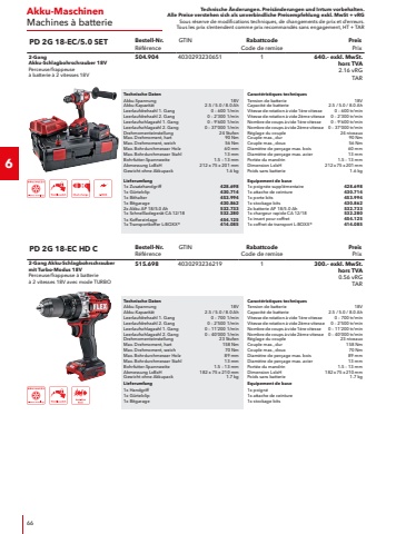 Technische %u00c4nderungen. Preis%u00e4nderungen und Irrtum vorbehalten.Alle Preise verstehen sich als unverbindliche Preisempfehlung exkl. MwSt + vRGSous r%u00e9serve de modifications techniques, de changements de prix et d%u2019erreurs. Tous les prix s%u2018entendent comme prix recommand%u00e9s sans engagement, HT + TAR18Zubeh%u00f6r WinkelschleiferAccessoires Meulese d%u2018angle2Trenn-Absaughaube f%u00fcr grosse Winkelschleifer 230 mmCarter de tron%u00e7onnage pour l%u2018aspiration de poussi%u00e8re avec meuleuse 230 mmRabattcodeCode de remise2Trenn-Absaughaube mit effizienter Staubabsaugung f%u00fcr exakte Schnitte bei Arbeiten mit Diamant-Trennscheiben in Verbindung mit 230 mm Winkelschleifern. Extrem stabil, keine Verwindung durch das seitliche Gewicht des Winkelschleifers, dank Stabilisator-Element. Bodenplatte mit Rollen f%u00fcr einen einfachen Vorschub, Seitenhandgriff wahlweise links oder rechts montierbar. Inkl. Sauganschluss f%u00fcr FLEX Clip-System und Adapter f%u00fcr F%u00fchrungsschiene. Tiefenanschlag mit Skala zur Voreinstellung der Schnitttiefe f%u00fcr die Verwendung mit oder ohne F%u00fchrungsschiene. Maximale Schnitt-Tiefe 60 mm.Capot d%u2018aspiration de tron%u00e7onnage avec aspiration efficace des poussi%u00e8res pour des coupes pr%u00e9cises lors de travaux avec des disques %u00e0 tron%u00e7onner diamant%u00e9s en combinaison avec des meuleuses d%u2018angle de 230 mm. Extr%u00eamement stable, pas de torsion due au poids lat%u00e9ral de la meuleuse d%u2018angle, gr%u00e2ce %u00e0 l%u2018%u00e9l%u00e9ment stabilisateur. Plaque de fond avec roulettes pour une avance facile, poign%u00e9e lat%u00e9rale pouvant %u00eatre mont%u00e9e au choix %u00e0 gauche ou %u00e0 droite. Raccord d%u2018aspiration pour syst%u00e8me de clipsage FLEX et adaptateur pour rail de guidage inclus. But%u00e9e de profondeur avec %u00e9chelle gradu%u00e9e pour le pr%u00e9r%u00e9glage de la profondeur de coupe pour l%u2018utilisation avec ou sans rail de guidage. Profondeur de coupe maximale de 60 mm.BezeichnungD%u00e9signationDurchmesserDiam%u00e8treBestell-Nr.R%u00e9f%u00e9renceVEUEPreis PrixDCG AG 230230 mm471.8951239.%u2013Schutzhauben-Deckel-Trennen, universalCouvercle pour capot de protection, universelRabattcodeCode de remise2Zur werkzeuglosen Umr%u00fcstung der vorhandenen Schutzhaube f%u00fcr Trennarbeiten.Pour transformer sans outil le capot de protection existant pour les travaux de tron%u00e7onnageBezeichnungD%u00e9signationDurchmesserDiam%u00e8treBestell-Nr.R%u00e9f%u00e9renceVEUEPreis PrixGU-AD D125125 mm446.041144.%u2013GU-AD D180180 mm446.718166.%u2013GU-AD D230230 mm446.068178.%u2013Absaughaube mit abnehmbarem RandsegmentCapot d%u2018aspiration avec segment amovibleRabattcodeCode de remise2Erm%u00f6glicht randnahes Arbeiten bei h%u00f6chster Absaugleistung. H%u00f6henverstellung %u00fcber Innensechskantschraube erlaubt ein schnelles Anpassen der Absaughaube auf die Werkzeugh%u00f6he. Hinweis: f%u00fcr das Arbeiten mit der Absaughaube und Diamantschleiftellern wird ein Winkelschleifer mit mindestens 1500 Watt empfohlen. Nur passend f%u00fcr Winkelschleifer mit Rastmechanik-Schutzhaube.Permet de travailler au plus pr%u00e8s des bords avec une puissance d%u2018aspiration maximale. Le r%u00e9glage en hauteur par vis %u00e0 six pans creux permet d%u2018adapter rapidement la hotte d%u2018aspiration %u00e0 la hauteur de l%u2018outil. Remarque : pour travailler avec la hotte d%u2018aspiration et les plateaux de pon%u00e7age diamant%u00e9s, il est recommand%u00e9 d%u2018utiliser une meuleuse d%u2018angle d%u2018au moins 1500 watts. Convient uniquement aux meuleuses d%u2018angle avec capot de protection %u00e0 m%u00e9canisme d%u2018encliquetage.BezeichnungD%u00e9signationDurchmesserDiam%u00e8treBestell-Nr.R%u00e9f%u00e9renceVEUEPreis PrixSG-R D125125 mm452.5721110.%u2013B%u00fcrstenkranzBrosseRabattcodeCode de remise2B%u00fcrstenkranz f%u00fcr Absaughaube, enth%u00e4lt zwei Segmentteile.Couronne de brosses pour hotte d%u2018aspiration, contient deux parties de segment.BezeichnungD%u00e9signationBestell-Nr.R%u00e9f%u00e9renceVEUEPreis PrixBK-H SG-R D125454.656148.%u2013