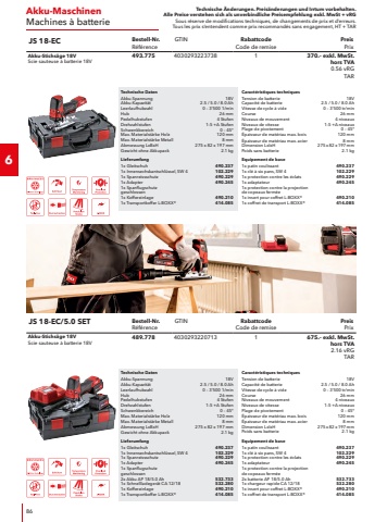 Technische %u00c4nderungen. Preis%u00e4nderungen und Irrtum vorbehalten.Alle Preise verstehen sich als unverbindliche Preisempfehlung exkl. MwSt + vRGSous r%u00e9serve de modifications techniques, de changements de prix et d%u2019erreurs. Tous les prix s%u2018entendent comme prix recommand%u00e9s sans engagement, HT + TAR384Zubeh%u00f6r Metalloberfl%u00e4chen-BearbeitungAccessoires Traitement de surface m%u00e9talliqueSchleifh%u00fclse MESHFLEXManchon abrasif MESHFLEXRabattcodeCode de remise2Zum Entfernen von leichten Besch%u00e4digungen, Kratzern, Anlauffarben, Flugrost, Zunder und Schmutz. Anlauffarben an Schweissn%u00e4hten lassen sich bei d%u00fcnnen Blechen ohne W%u00e4rmeverzug entfernen. Geeignet f%u00fcr Schleif-, Reinigungs- und Finishingarbeiten an Edelstahlstahl, Stahl, Titanlegierungen, Leichtmetallen, Buntmetallen und Kunststoffen.Elimination des petits dommages et des rayures l%u00e9g%u00e8res. Elimination des couleurs de rendu, des couches minces de rouille, des m%u00e2chefers et des salet%u00e9s. Elimination des couleurs de rendu sur les cordons de soudure pour les t%u00f4les minces sans d%u00e9formation sous l%u2019effet de la chaleur. Pour les travaux de pon%u00e7age, nettoyage et finition sur l%u2019acier inoxydable, l%u2019acier, les alliages de titane, les m%u00e9taux l%u00e9gers, les m%u00e9taux non ferreux et les plastiques.BezeichnungD%u00e9signationDurchmesserDiam%u00e8treBreiteLargeurKornGrainBestell-Nr.R%u00e9f%u00e9renceVEUEPreis Prix90x100 ME-A10090 mm100 mmA 100256.288120.%u201390x100 ME-A24090 mm100 mmA 240256.289120.%u201390x100 ME-A40090 mm100 mmA 400256.290120.%u2013100x100 ME-A100100 mm100 mmA 100434.590128.%u2013100x100 ME-A240100 mm100 mmA 240434.604128.%u2013100x100 ME-A400100 mm100 mmA 400434.612128.%u2013Schleifband ZIRCOFLEXBande abrasive ZIRCOFLEXRabattcodeCode de remise9Schleifband mit hochwertigem, selbstsch%u00e4rfendem Zirkonkorund f%u00fcr verl%u00e4ngerte Standzeit. Hohe Abtragsleistung beim Grob- und Zwischenschliff von Stahl- und Edelstahloberfl%u00e4chen.Bande abrasive avec corindon de zirconium de haute qualit%u00e9 %u00e0 auto-aff%u00fbtage pour une plus longue dur%u00e9e de vie. Capacit%u00e9 abrasive %u00e9lev%u00e9e lors du pon%u00e7age grossier et interm%u00e9diaire des surfaces en acier et acier inoxydable.BezeichnungD%u00e9signationBandl%u00e4ngeLongueur de bandeBandbreiteLargeur de bandeKornGrainBestell-Nr.R%u00e9f%u00e9renceVEUEPreis Prix760x40 ZI-P36 VE10760 mm40 mmP 36438.4641055.%u2013760x40 ZI-P40 VE10760 mm40 mmP 40438.4721054.%u2013760x40 ZI-P60 VE10760 mm40 mmP 60438.4801054.%u2013760x40 ZI-P80 VE10760 mm40 mmP 80438.4991048.%u2013760x40 ZI-P120 VE10760 mm40 mmP 120438.5021048.%u2013Schleifband CORUFLEXBande abrasive CORUFLEXRabattcodeCode de remise9Hochflexibles Schleifband mit verg%u00fctetem Korundkorn und schleifaktiven Wirkstoffen f%u00fcr die Edelstahlbearbeitung. Besonders geeignet f%u00fcr den Feinschliff.Bande abrasive ultra souple avec grain corindon tremp%u00e9 et agents abrasifs actifs pour le traitement de l%u2019acier inoxydable. Particuli%u00e8rement adapt%u00e9 au pon%u00e7age de finition.BezeichnungD%u00e9signationBandl%u00e4ngeLongueur de bandeBandbreiteLargeur de bandeKornGrainBestell-Nr.R%u00e9f%u00e9renceVEUEPreis Prix760x40 CR-P80 VE10760 mm40 mmP 80326.7391042.%u2013760x40 CR-P120 VE10760 mm40 mmP 120326.7551039.%u2013760x40 CR-P180 VE10760 mm40 mmP 180434.9061039.%u2013760x40 CR-P240 VE10760 mm40 mmP 240434.9141039.%u2013Schleifband MESHFLEXBande abrasive MESHFLEXRabattcodeCode de remise2Zum Entfernen von leichten Besch%u00e4digungen, Kratzern, Anlauffarben, Flugrost, Zunder und Schmutz. Anlauffarben an Schweissn%u00e4hten lassen sich bei d%u00fcnnen Blechen ohne W%u00e4rmeverzug entfernen. Geeignet f%u00fcr Schleif-, Reinigungs- und Finishingarbeiten an Edelstahlstahl, Stahl, Titanlegierungen, Leichtmetallen, Buntmetallen und Kunststoffen.Elimination des petits dommages et des rayures l%u00e9g%u00e8res. Elimination des couleurs de rendu, des couches minces de rouille, des m%u00e2chefers et des salet%u00e9s. Elimination des couleurs de rendu sur les cordons de soudure pour les t%u00f4les minces sans d%u00e9formation sous l%u2019effet de la chaleur. Pour les travaux de pon%u00e7age, nettoyage et finition sur l%u2019acier inoxydable, l%u2019acier, les alliages de titane, les m%u00e9taux l%u00e9gers, les m%u00e9taux non ferreux et les plastiques.BezeichnungD%u00e9signationBandl%u00e4ngeLongueur de bandeBandbreiteLargeur de bandeKornGrainBestell-Nr.R%u00e9f%u00e9renceVEUEPreis Prix760x40 ME-A100 VE3760 mm40 mmA 100326.895374.%u2013760x40 ME-A240 VE3760 mm40 mmA 240326.879362.%u2013760x40 ME-A400 VE3760 mm40 mmA 400326.852362.%u2013