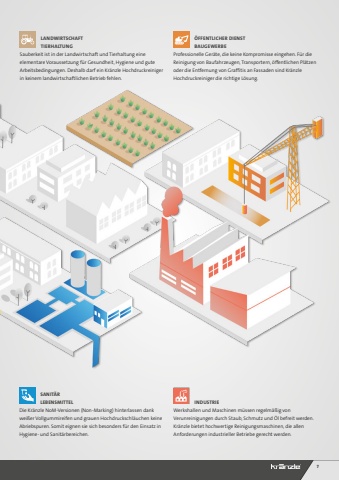 7INDUSTRIEWerkshallen und Maschinen m%u00fcssen regelm%u00e4%u00dfig von Verunreinigungen durch Staub, Schmutz und %u00d6l befreit werden. Kr%u00e4nzle bietet hochwertige Reinigungsmaschinen, die allen Anforderungen industrieller Betriebe gerecht werden.LANDWIRTSCHAFT TIERHALTUNGSauberkeit ist in der Landwirtschaft und Tierhaltung eine elementare Voraussetzung f%u00fcr Gesundheit, Hygiene und gute Arbeitsbedingungen. Deshalb darf ein Kr%u00e4nzle Hochdruckreiniger in keinem landwirtschaftlichen Betrieb fehlen.SANIT%u00c4R LEBENSMITTELDie Kr%u00e4nzle NoM-Versionen (Non-Marking) hinterlassen dank wei%u00dfer Vollgummireifen und grauen Hochdruckschl%u00e4uchen keine Abriebspuren. Somit eignen sie sich besonders f%u00fcr den Einsatz in Hygiene- und Sanit%u00e4rbereichen.%u00d6FFENTLICHER DIENST BAUGEWERBEProfessionelle Ger%u00e4te, die keine Kompromisse eingehen. F%u00fcr die Reinigung von Baufahrzeugen, Transportern, %u00f6ffentlichen Pl%u00e4tzen oder die Entfernung von Graffitis an Fassaden sind Kr%u00e4nzle Hochdruckreiniger die richtige L%u00f6sung.