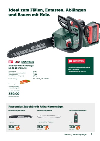 Baum- / StrauchpflegeIdeal zum F%u00e4llen, Entasten, Abl%u00e4ngenund Bauen mit Holz.Passendes Zubeh%u00f6r f%u00fcr Akku-Kettens%u00e4ge.2x18-Volt-Akku-Kettens%u00e4geMS 36-18 LTX BL 40 Schnittl%u00e4nge 36 cmMax. Kettengeschwindigkeit22 m/sTreibgliedst%u00e4rke1,1 mmGewicht (ohne Akkupack)3,2 kgService GruppeH02=135.00 / FS4=215.00%u2192ohne Akkupack%u2192ohne Ladeger%u00e4tBestell-Nr. 601613850 369.00*Preis inkl. MwSt/vRGLieferumfangSchnittstarke Oregon-Ketteund -Schiene.Schienenl%u00e4nge 40 cmHINWEIS%u219240 cm (3/8\Bestell-Nr. 628439000 23.50inkl. MwStOregon S%u00e4geschieneOregon S%u00e4gekette%u219240 cmBestell-Nr. 628437000 30.50inkl. MwSt%u21921 lBestell-Nr. 628441000 16.00inkl. MwStBio-S%u00e4gekettenhaft%u00f6l7