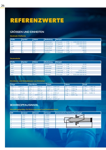 26REFERENZWERTEGR%u00d6SSEN UND EINHEITENDezimale VielfachePr%u00e4fix Symbol Faktor Bedeutung Beispieltera T 1012 billionenfach 1 Terawatt = 1 TW = 1 000 000 000 000 Wgiga G 109 milliardenfach 1 Gigawatt = 1 GW = 1 000 000 000 Wmega M 106 millionenfach 1 Megawatt = 1 MW = 1 000 000 Wkilo k 103 tausendfach 1 Kilowatt = 1 KW = 1 000 Whecto h 102 hundertfach 1 Hektowatt = 1 hW = 100 Wdeca da 101 zehnfach 1 Dekawatt = 1 daW = 10 WDezimalteilePr%u00e4fix Symbol Faktor Bedeutung Beispieldeci d 10-1 zehntel 1 Deziwatt = 1 dW = 0,1 Wcenti c 10-2 hundertstel 1 Zentiwatt = 1 cW = 0,01 Wmilli m 10-3 tausendstel 1 Milliwatt = 1 mW = 0,001 Wmicro %u03bc 10-6 millionstel 1 Mikrowatt = 1 %u03bcW = 0,000 001 Wnano m 10-9 milliardstel 1 Nanowatt = 1 nW = 0 000 000 001 Wpico p 10-12 billionstel 1 Picowatt = 1 pW = 0 000 000 000 001 WDividieren und Multiplizieren von EinheitenL%u00e4nge Oberfl%u00e4che Inhalt Masse Kraft1 km = 1 000 m 1 km2 = 100 ha 1 km3 = 1 000 dm3 1 t = 1 000 kg 1 MN = 1 000 kN1 m = 10 dm 1 ha = 100 a 1 dm3 = 1 000 dm3 1 mg = 1 000 kg 1 kN = 1 000 N1 dm = 10 cm 1 a = 100 m2 1 hl = 100 l 1 kg = 1 000 g 1 daN = 10 N1 cm = 10 mm 1 m2 = 100 dm2 1 l = 1 000 ml 1 mg = 0,001 g 1 MN = 0,001 N1 mm = 0,001 m 1 m2 = 10 0000 cm2 1 cl = 0,001 l 1 %u03bcg = 0,001 mg1 %u03bcm = 0,001 mm 1 cm2 = 100 mm2 1 ml = 0,001 l1 inch = 25,4 mm 1 sq.in= 6,452 cm2 1 cu.in= 16,39 cm3BOHRKOPFAUSWAHL Morsekegelgr%u00f6%u00dfen f%u00fcr Bohrmaschinen und DrehmaschinenMK A (mm) B (mm) d1 (mm) Schematische Zeichnung Morsekegel0 9,2 70 9,0451 12,2 80 12,0652 18,0 100 17,7803 24,1 125 23,6254 31,6 160 31,2675 44,7 200 44,3996 63,8 270 63,348Ad1B