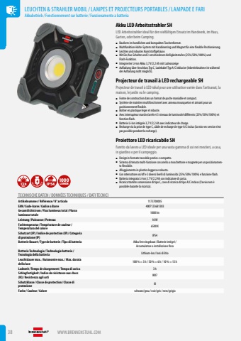 LEUCHTEN & STRAHLER MOBIL/LAMPES ET PROJECTEURS PORTABLES/LAMPADE E FARIAkkubetrieb/ Fonctionnement sur batterie/ Funzionamento a batteria38 WWW.BRENNENSTUHL.COMAkku LED Arbeitsstrahler SHLED Arbeitsstrahler ideal f%u00fcr den vielf%u00e4ltigen Einsatz im Handwerk, im Haus, Garten, oder beim Camping.%u25a0 Bauform im handlichen und kompakten Taschenformat.%u25a0 Multifunktion-Halte-System mit Karabinerring und Magnet f%u00fcr eine flexible Positionierung.%u25a0 Leichtes und robustes Kunststoffgeh%u00e4use.%u25a0 Mit Ein/Aus Schalter und 3 verschiedenen Helligkeitsstufen (25%/50%/100%) und Flash-Funktion.%u25a0 Integrierter Li-Ion Akku 3,7 V/2,2 Ah mit Ladeanzeige %u25a0 Aufladung %u00fcber Anschluss Typ C, Ladekabel Typ A/C inklusive (Inbetriebnahme ist w%u00e4hrend der Aufladung nicht m%u00f6glich).Projecteur de travail %u00e0 LED rechargeable SHProjecteur de travail %u00e0 LED id%u00e9al pour une utilisation vari%u00e9e dans l%u2019artisanat, la maison, le jardin ou le camping.%u25a0 Forme de construction dans un format de poche maniable et compact.%u25a0 Syst%u00e8me de maintien multifonctionnel avec anneau mousqueton et aimant pour un positionnement flexible.%u25a0 Bo%u00eetier en plastique l%u00e9ger et robuste.%u25a0 Avec interrupteur marche/arr%u00eat et 3 niveaux de luminosit%u00e9 diff%u00e9rents (25%/50%/100%) et fonction flash.%u25a0 Batterie Li-Ion int%u00e9gr%u00e9e 3,7 V/2,2 Ah avec indicateur de charge. %u25a0 Recharge via la prise de type C, c%u00e2ble de recharge de type A/C inclus (la mise en service n%u2019est pas possible pendant la recharge).Proiettore LED ricaricabile SHFaretto da lavoro a LED ideale per una vasta gamma di usi nei mestieri, a casa, in giardino o per il campeggio.%u25a0 Design in formato tascabile pratico e compatto.%u25a0 Sistema di tenuta multi-funzione con anello a moschettone e magnete per un posizionamento flessibile.%u25a0 Alloggiamento in plastica leggera e robusta.%u25a0 Con interruttore on/off e 3 diversi livelli di luminosit%u00e0 (25%/50%/100%) e funzione flash.%u25a0 Batteria integrata Li-Ion 3.7 V/2.2 Ah con indicatore di carica. %u25a0 Ricarica tramite connessione di tipo C, cavo di ricarica di tipo A/C incluso (l%u2019avvio non %u00e8 possibile durante la ricarica).TECHNISCHE DATEN / DONN%u00c9ES TECHNIQUES / DATI TECNICIArtikelnummer/ R%u00e9f%u00e9rence / N%u00b0 articolo 1173700005EAN/ Code-barre / Codice a Barre 4007123681303Gesamtlichtstrom/ Flux lumineux total/ Flusso luminoso totale 1000 lmLeistung / Puissance / Potenza 10 WFarbtemperatur/ Temp%u00e9rature de couleur/ Temperatura del colore 6500 KSchutzart (IP)/ Indice de protection (IP)/ Categoria di protezione (IP) IP54Batterie Bauart/ Type de batterie / Tipo di batteria Akku fest eingebaut/ Batterie int%u00e9gr%u00e9/Accumulatore a installazione fissaBatterie Technologie / Technologie batterie / Tecnologia della batteria Lithium-Ion / Ioni di litioLeuchtdauer max./ Autonomie max./ Max. durata della luce 100 % = 3 h / 50 % = 6 h / 10 % = 13 hLadezeit/ Temps de chargement/ Tempo di carica 3 hSchlagfestigkeit/ Indice de r%u00e9sistance aux chocs (IK)/ Resistenza agli urti IK07Schutzklasse / Classe de protection / Classe di protezione IIIFarbe / Couleur/ Colore schwarz/grau/ noir/gris/ nero/grigioMAX.13h USB RECHARGEABLEIP541000LUMEN