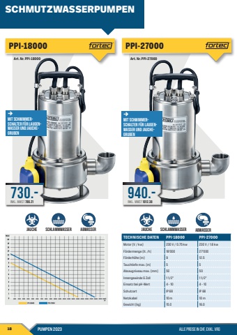 18 PUMPEN 2023 ALLE PREISE IN CHF, EXKL. VRGTECHNISCHE DATEN PPI-18000 PPI-27000Motor (V / kw) 230 V / 0.75 kw 230 V / 1.6 kwF%u00f6rdermenge (lt. /h) 18'000 27'000 F%u00f6rderh%u00f6he (m) 9 12.5Tauchtiefe max. (m) 5 5 Absaugniveau max. (mm) 50 50Innengewinde G Zoll 1 1/2\1 1/2\Einsatz bei pH-Wert 4 - 10 4 - 10Schutzart IP 68 IP 68Netzkabel 10 m 10 mGewicht (kg) 15.0 16.0Art. Nr. PPI-27000940.-INKL. MWST 1012.38PPI-27000%u2192Mit Schwimmerschalter F%u00fcr Laugenwasser und JauchegrubenSchlammwasser AbwasserArt. Nr. PPI-18000730.-INKL. MWST 786.21PPI-18000%u2192Mit Schwimmerschalter F%u00fcr Laugen- wasser und Jauche- grubenSCHMUTZWASSERPUMPENJauche Schlammwasser Abwasser Jauche