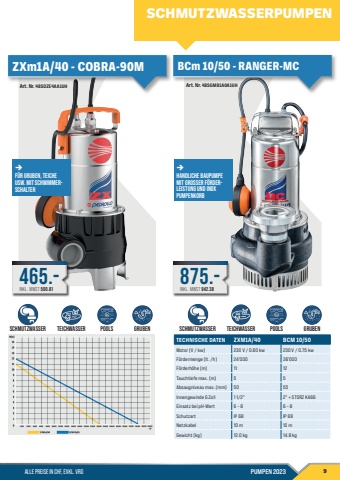 ALLE PREISE IN CHF, EXKL. VRG PUMPEN 2023 9Art. Nr. 48SGM81A0A1UH875.-INKL. MWST 942.38Art. Nr. 48SDZE4AA1UH465.-INKL. MWST 500.81ZXm1A/40 - COBRA-90M BCm 10/50 - RANGER-MCTECHNISCHE DATEN ZXM1A/40 BCM 10/50Motor (V / kw) 230 V / 0.60 kw 230 V / 0.75 kwF%u00f6rdermenge (lt. /h) 24'000 36'000F%u00f6rderh%u00f6he (m) 11 12Tauchtiefe max. (m) 5 5Absaugniveau max. (mm) 50 55Innengewinde G Zoll 1 1/2\2\Einsatz bei pH-Wert 6 %u2013 8 6 %u2013 8Schutzart IP 68 IP 68Netzkabel 10 m 10 mGewicht (kg) 12.0 kg 14.8 kg%u2192F%u00fcr Gruben, Teiche usw. mit Schwimmerschalter%u2192Handliche Baupumpe mit grosser F%u00f6rderleistung und Inox Pumpenkorb Schmutzwasser Teichwasser Pools GRUBEN Schmutzwasser Teichwasser Pools GRUBENSCHMUTZWASSERPUMPEN