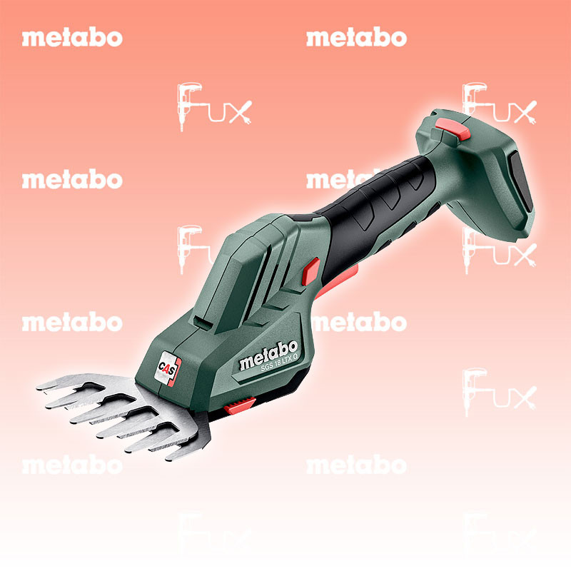 Das Ladenlokal bleibt vom 25. Dezember 2025 bis am 04. Januar 2026 geschlossen. Bestellungen und Lieferungen von Neugeräten werden trotz Ferienabwesenheit in gewohnter Fux-Manier entgegengenommen und ausgeliefert. Zu "Akku Gras & Heckenschere" von Metabo FULL Service: 36 Monate zum Nulltarif für Sie! Weitere Infos zum FULL Service Dieses Produkt ist CAS kompatibel! Weitere Infos zu CAS Metabo SGS 18 LTX Q Gras & Heckenschere Bestell- und Artikelnummer: 601609840 2 in 1: Strauchschere für präzise Formschnitte an Büschen und Grasschere für saubere Rasenkanten Metabo Quick-System: werkzeugloser Schnellwechsel der beiden Messeraufsätze für flexibles Arbeiten Beste Schnittergebnisse durch lasergeschnittene, diamantgeschliffene Messer Hoher Anwenderschutz durch Sicherheitsschalter und Messer-Schnellstopp Leichtgewicht mit maximaler Laufruhe für ermüdungsarmes, gesundheitsschonendes Arbeiten Schlanker, gummierter Griffbereich für komfortables und sicheres Führen der Strauch- und Grasschere Stabile Teleskopstange für rückenschonendes, exaktes Schneiden von Rasenkanten als Zubehör erhältlich Mit metaBOX, der intelligenten Lösung für Transport und Aufbewahrung OHNE AKKUS UND LADEGERÄT Technische Daten Akkuspannung 18 V Strauchmesser Schnittlänge 20 cm Strauchmesser Schnittstärke 8 mm Grasmesser Schnittbreite 11,5 cm Schnittzahl bei Leerlauf 2.300 /min Gewicht (mit Akkupack) 1,2 kg Standard-Ausrüstung Strauchmesser metaBOX 145 L ohne Akkupack, ohne Ladegerät Grasmesser Aufbewahrungsschuber Geliefert im Koffer Zubehör Verbrauchsmaterial Listenpreis CHF 149.00 Fuxpreis CHF 127.00 inkl. 8.1% MwSt, inkl vRG Frankolieferung Kein Grauimport! Produkt bestellen 1 Stück 2 Stück 3 Stück 4 Stück 5 Stück 6 Stück 7 Stück 8 Stück 9 Stück 10 Stück Alle Angaben ohne Gewähr und solange Vorrat reicht!Wiederverkäufer werden?Lehrlingsrabatt? Produkt als PDFVideo LiHD 1Video LiHD 2 360° Ansicht AKTION 15%