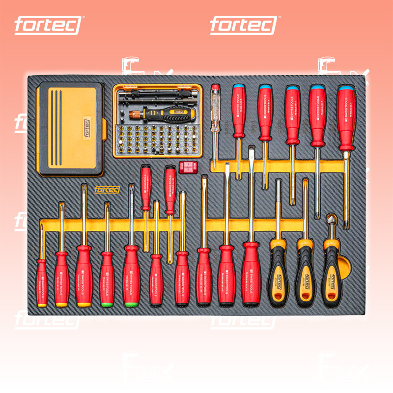 - Bestückt mit 706 Werkzeugen, PB-Swiss Tools Schraubendrehern, Zangen von Knipex, plus fortec Drehmomentschlüssel mit 4 St. passenden Schlagschrauberstecknüssen.
