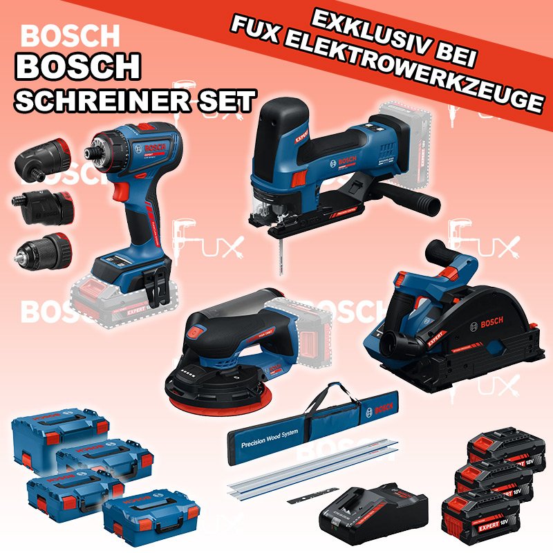 Bosch Expert EXSchreiner Set  4 EXST18V-155S Akku-Stichsäge EXSR18V-90FC Akku-Bohrschrauber EXKT18V-52G Akku-Tauchsäge EXEX18V-150-5 Akku-Exzenterschleifer FSN 1400 Set Führungsschienensysteme Systemzubehör 3x EXBA18V-80 + EXAL18V-160 Starter-Set