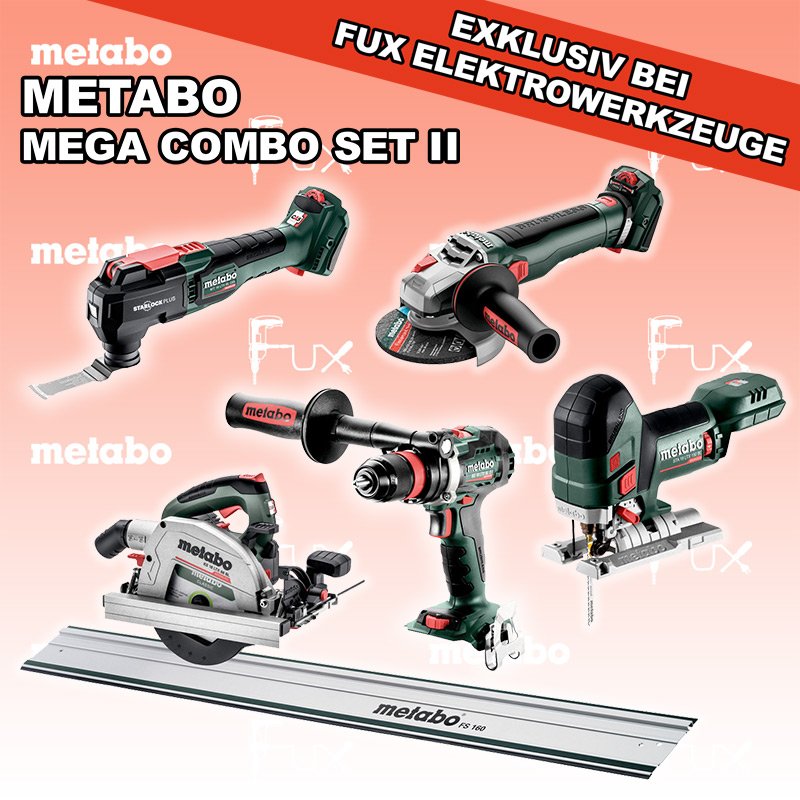Heute auf dieses Produkt 48% Rabatt! Zu "Combo Set 18 Volt " von Metabo FULL Service: 36 Monate zum Nulltarif für Sie! Weitere Infos zum FULL Service Dieses Produkt ist CAS kompatibel! Weitere Infos zu CAS Sparfux Aktionen FUX SPECIAL EXKLUSIV BEI FUX Metabo Mega Combo Set 2 SOLO Bestell- und Artikelnummer: Mega Combo Set 2 SOLO STA 18 LTX 150 BL Akku-StichsägeAkkuspannung 18 V Hubzahl 1.000-3.500 /min Gewicht ohne Akkupack 1.9 kgInfos BS 18 LTX BL Q I Akku-BohrschrauberAkkuspannung 18 V Drehzahl 0-550 / 0-2000 U/min Drehmoment hart / weich 130 / 65 Nm Gewicht (mit Akkupack) 2.3 kgInfos MT 18 LTX BL QSL Akku-Multitool Akkuspannung 18 V Schwingzahl bei Leerlauf 8.000 - 20.000 /min Schleifplatte, Maß Eck zu Eck 93 mm Gewicht 1.7 kgInfos WVB 18 LT BL 11-125 Quick Akku-WinkelschleiferAkkuspannung 18 V Drehzahl 2.800 - 10.000 / min Ø 125 mm Scheiben Gewicht (mit Akkupack) 2.5 kgInfos KS 18 LTX 66 BL Akku HandkreissägeAkkuspannung 18 V Schnitt-Tiefe bei 90° 0-66 mm Sägeblatt 165 mm Gewicht 4.5 kgInfos FS 160 FührungsschieneGesamtlänge 1600 mmInfos Registriere die in diesem Set vorhandenen Metabo Maschinen auf metabo.ch, und ergattere dir bis zu 5 Gratis Akkus!Zusätzlich offerieren wir zu diesem Set einen Gratis Akku!OHNE AKKUS UND LADEGERÄT Standard-Ausrüstung In diesem Set enthalten: STA 18 LTX 150 BL Akku-Stichsäge BS 18 LTX BL Q I Akku-Bohrschrauber MT 18 LTX BL QSL Akku-Multitool WVB 18 LT BL 11-125 Quick Akku-Winkelschleifer KS 18 LTX 66 BL Akku Handkreissäge FS 160 Führungsschiene Zubehör Verbrauchsmaterial Listenpreis CHF 1'909.50 Fuxpreis CHF 987.00 inkl. 8.1% MwSt, inkl vRG Versand CHF 30.00 Kein Grauimport! Produkt bestellen 1 Stück 2 Stück 3 Stück 4 Stück 5 Stück 6 Stück 7 Stück 8 Stück 9 Stück 10 Stück Alle Angaben ohne Gewähr und solange Vorrat reicht!Wiederverkäufer werden? Produkt als PDFVideo LiHD 1Video LiHD 2 AKTION 48%