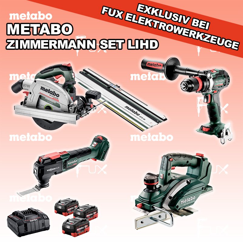 Heute auf dieses Produkt 27% Rabatt! Zu "Zimmermann Set" von Metabo FULL Service: 36 Monate zum Nulltarif für Sie! Weitere Infos zum FULL Service Dieses Produkt ist CAS kompatibel! Weitere Infos zu CAS Sparfux Aktionen FUX SPECIAL EXKLUSIV BEI FUX Metabo Zimmermann SET 6 LiHD Bestell- und Artikelnummer: Zimmermann SET 6 LiHD BS 18 LTX BL Q I Akku-BohrschrauberAkkuspannung 18 V Drehzahl 0-550 / 0-2000 U/min Drehmoment hart / weich 130 / 65 Nm Gewicht (mit Akkupack) 2.3 kgInfos MT 18 LTX BL QSL Akku-Multitool Akkuspannung 18 V Schwingzahl bei Leerlauf 8.000 - 20.000 /min Schleifplatte, Maß Eck zu Eck 93 mm Gewicht 1.7 kgInfos HO 18 LTX 20-82 Akku-Einhand-HobelAkkuspannung 18 V Hobelbreite 82 mm Spanabnahme einstellbar 0-2 mm Gewicht 3.5 KgInfos KS 18 LTX 66 BL Akku HandkreissägeAkkuspannung 18 V Schnitt-Tiefe bei 90° 0-66 mm Sägeblatt 165 mm Gewicht 4.5 kgInfos Kappschiene KFS 44Gesamtlänge 834 mm Schnittlänge 440 mmInfos 3 x 18 V, 5.5 Ah, LiHD Akkupack18 V 5.5 Ah ( LiHD Akkus ) Infos ASC 145, 12 - 36 V "Air Cooled" LadegerätZum Aufladen aller Li-Power Schiebesitz-Akkupacks (12 V - 36 V). Ladestrom 8.0 AInfos Registriere die in diesem Set vorhandenen Metabo Maschinen auf metabo.ch, und ergattere dir bis zu 5 Gratis Akkus!Zusätzlich offerieren wir zu diesem Set einen Gratis Akku! Standard-Ausrüstung In diesem Set enthalten: BS 18 LTX BL Q I Akku-Bohrschrauber MT 18 LTX BL QSL Akku-Multitool HO 18 LTX 20-82 Akku-Einhand-Hobel KS 18 LTX 66 BL Akku Handkreissäge Kappschiene KFS 44 3 x 18 V, 5.5 Ah, LiHD Akkupack ASC 145, 12 - 36 V "Air Cooled" Ladegerät Listenpreis CHF 2'036.50 Fuxpreis CHF 1'472.00 inkl. 8.1% MwSt, inkl vRG Versand CHF 25.00 Kein Grauimport! Produkt bestellen 1 Stück 2 Stück 3 Stück 4 Stück 5 Stück 6 Stück 7 Stück 8 Stück 9 Stück 10 Stück Alle Angaben ohne Gewähr und solange Vorrat reicht!Wiederverkäufer werden? Produkt als PDF NEUHEITAKTION 27%