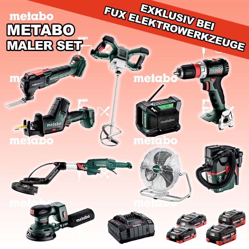 Metabo Maler Set 6 BS 18 L BL Q Akku-Bohrschrauber RW 18 LTX BL 120 Akku-Rührwerk AS 18 L PC Compact Akku-Sauger R 12-18 DAB+ BT Akku-Baustellenradio SSE 18 LTX BL Compact Akku-Säbelsäge MT 18 LTX BL QSL Akku-Multitool AV 18 Akku-Ventilator SXA 18 LTX 125 BL Exzenterschleifer LSV 5-225 Comfort Langhalsschleifer 18 V,  4.0 Ah, LiHD Akkupack 18 V,  5.5 Ah, LiHD Akkupack ASC 145, 12 - 36 V "Air Cooled" Ladegerät
