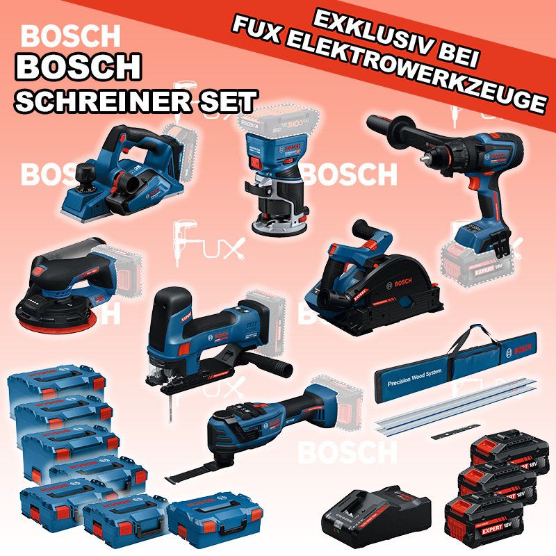 Das Ladenlokal bleibt vom 23. Februar 2026 bis am 28. Februar 2026 geschlossen. Bestellungen und Lieferungen von Neugeräten werden trotz Ferienabwesenheit in gewohnter Fux-Manier entgegengenommen und ausgeliefert. Zu "Schreiner Set" von Bosch Professional FUX SPECIAL EXKLUSIV BEI FUX Bosch Expert EXSchreiner Set 10 Bestell- und Artikelnummer: Bosch Schreiner Set 10 5 Jahre Garantie auf Bosch Expert Maschinen EXST18V-155S Akku-StichsägeAkkuspannung 18 V Hubzahl bei Leerlauf 800 - 3800 min⁻¹ Hubhöhe 26 mm Gewicht exkl. Akku 1.9 kgInfos EXSR18V-150 Akku-BohrschrauberAkkuspannung 18 V Drehmoment 84 / 100 / 150 Nm Leerlaufdrehzahl 0 – 550 / 0 – 2200 min⁻¹ Gewicht exkl. Akku 2.1 kgInfos GKF 18V-8 Akku-KantenfräseAkkuspannung 18 V Leerlaufdrehzahl 10000 – 30000 min⁻¹ 6 mm, 8 mm, 1/4'' Gewicht exkl. Akku 1.1 kg Infos EXKT18V-52G Akku-TauchsägeAkkuspannung 18 V Leerlaufdrehzahl 2800 – 5500 min⁻¹ Gewicht exkl. Akku 4.1 kgInfos GHO 18V-26 Akku-EinhandhobelAkkuspannung 18 V Spanabnahme einstellbar 0 - 2.6 mm Infos EXOP18V-40 Akku-Multi-CutterAkkuspannung 18 V Leerlaufschwingzahl 10000 – 20000 min⁻¹ Oszillationswinkel links und rechts 2 ° Gewicht exkl. Akku 1.24 kgInfos EXEX18V-150-5 Akku-ExzenterschleiferAkkuspannung 18 V Schleifteller-Ø 150 mm Leerlaufdrehzahl 5000 – 10000 Umin Schwingzahl 10000 – 20000 min⁻¹ Gewicht exkl. Akku 1.2 kgInfos FSN 1400 Set Führungsschienensysteme Systemzubehör2 x Führungsschiene FSN 1400 Verbindungsstück FSN VEL Tasche FSN BAGInfos 3x EXBA18V-80 + EXAL18V-160 Starter-Set3 x EXBA18V-80 Akkupack EXAL18V-160 LadegerätInfos Standard-Ausrüstung In diesem Set enthalten: EXST18V-155S Akku-Stichsäge EXSR18V-150 Akku-Bohrschrauber GKF 18V-8 Akku-Kantenfräse EXKT18V-52G Akku-Tauchsäge GHO 18V-26 Akku-Einhandhobel EXOP18V-40 Akku-Multi-Cutter EXEX18V-150-5 Akku-Exzenterschleifer FSN 1400 Set Führungsschienensysteme Systemzubehör 3x EXBA18V-80 + EXAL18V-160 Starter-Set Geliefert im Koffer Zubehör Listenpreis CHF 3'659.80 Fuxpreis CHF 2'821.00 inklusive 8.1% MwSt Kostenloser Versand Kein Grauimport! Produkt bestellen Das Produkt ist momentan nicht lieferbar!Bestätigen sie, dass sie damit einverstanden sind! 1 Stück 2 Stück 3 Stück 4 Stück 5 Stück 6 Stück 7 Stück 8 Stück 9 Stück 10 Stück Alle Angaben ohne Gewähr und solange Vorrat reicht! Produkt als PDF NEUHEITAKTION 22%