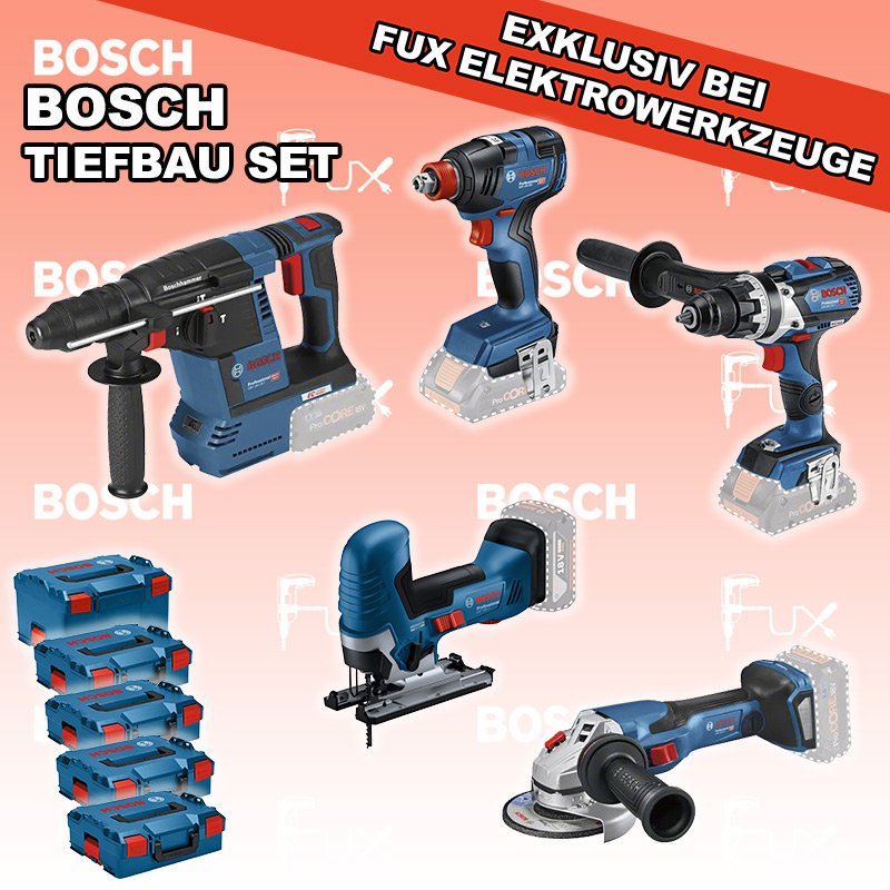 Bosch Professional Tiefbau Set 1 SOLO GSR 18V-110 C Akku-Bohrschrauber GST 18V-125 S Akku-Stichsäge GBH 18V-26 F Akku-Bohrhammer GDX 18V-200 Akku-Drehschlagschrauber GWS 18V-15 C Akku-Winkelschleifer Biturbo