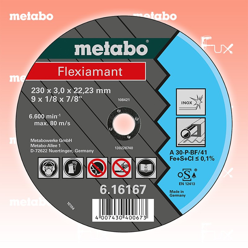 Das Ladenlokal bleibt vom 25. Dezember 2025 bis am 04. Januar 2026 geschlossen. Bestellungen und Lieferungen von Neugeräten werden trotz Ferienabwesenheit in gewohnter Fux-Manier entgegengenommen und ausgeliefert. Zu "Qualitätsklasse A 30-P Trennscheiben" von Metabo Metabo Trennscheibe Stahl 125 mm Bestell- und Artikelnummer: 616738000 Universalscheibe für die Bearbeitung von rostfreien Stählen Härte: weich Hohe Schnittleistung bei hoher Standzeit Eisen- und schwefelarm < 0,1 % Arbeitshöchstgeschwindigkeit 80 m/s Technische Daten Qualitätsklasse A 30 P Durchmesser x Dicke x Bohrung 125 x 2.5 x 22.23 mm Ausführung gerade Max. Drehzahl 12200 Standard-Ausrüstung Verkaufseinheit 25 Stk. Listenpreis CHF 75.00 Fuxpreis CHF 64.00 inkl. 8.1% MwSt, inkl vRG Versand CHF 15.00 Kein Grauimport! Produkt bestellen Verkaufseinheit 25 Stk. 1 Stück 2 Stück 3 Stück 4 Stück 5 Stück 6 Stück 7 Stück 8 Stück 9 Stück 10 Stück 11 Stück 12 Stück 13 Stück 14 Stück 15 Stück 16 Stück 17 Stück 18 Stück 19 Stück 20 Stück 21 Stück 22 Stück 23 Stück 24 Stück 25 Stück 26 Stück 27 Stück 28 Stück 29 Stück 30 Stück 31 Stück 32 Stück 33 Stück 34 Stück 35 Stück 36 Stück 37 Stück 38 Stück 39 Stück 40 Stück 41 Stück 42 Stück 43 Stück 44 Stück 45 Stück 46 Stück 47 Stück 48 Stück 49 Stück 50 Stück Alle Angaben ohne Gewähr und solange Vorrat reicht!Wiederverkäufer werden?Lehrlingsrabatt? Produkt als PDF AKTION 15%