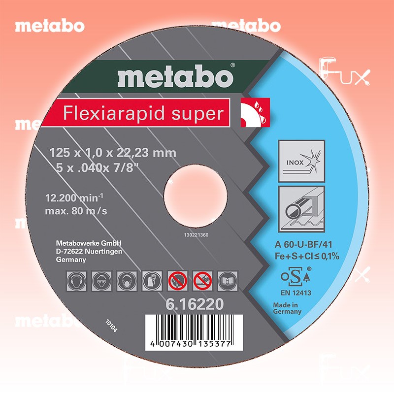 Das Ladenlokal bleibt vom 25. Dezember 2025 bis am 04. Januar 2026 geschlossen. Bestellungen und Lieferungen von Neugeräten werden trotz Ferienabwesenheit in gewohnter Fux-Manier entgegengenommen und ausgeliefert. Zu "Qualitätsklasse A 36-U / A 46-U / A 60-U Trennscheiben" von Metabo Metabo Trennscheibe Stahl 115 mm Bestell- und Artikelnummer: 616216000 Die superdünne Hochleistungsscheibe speziell für die Edelstahlbearbeitung Höchste Schnittleistung bei sehr hoher Standzeit durch Verwendung von Spezialkorunden Eisen-, schwefel- und chlorfrei (Fe + S + Cl ≤ 0,1 %) Für alle rost- und säurebeständigen Stähle (V2A, Nirosta, INOX), Federstähle, Werkzeugstähle Einsetzbar im Fahrzeugbau, Behälterbau, Karosseriebau, Schaltschrankbau usw. Trennscheiben für geräuscharme, gratfreie und präzise Trennschnitte Härte: hart Arbeitshöchstgeschwindigkeit 80 m/s Technische Daten Qualitätsklasse A 60 U Durchmesser x Dicke x Bohrung 115 x 1 x 22.23 mm Ausführung gerade Max. Drehzahl 13300 Standard-Ausrüstung Verkaufseinheit 25 Stk. Listenpreis CHF 100.00 Fuxpreis CHF 85.00 inkl. 8.1% MwSt, inkl vRG Versand CHF 15.00 Kein Grauimport! Produkt bestellen Verkaufseinheit 25 Stk. 1 Stück 2 Stück 3 Stück 4 Stück 5 Stück 6 Stück 7 Stück 8 Stück 9 Stück 10 Stück 11 Stück 12 Stück 13 Stück 14 Stück 15 Stück 16 Stück 17 Stück 18 Stück 19 Stück 20 Stück 21 Stück 22 Stück 23 Stück 24 Stück 25 Stück 26 Stück 27 Stück 28 Stück 29 Stück 30 Stück 31 Stück 32 Stück 33 Stück 34 Stück 35 Stück 36 Stück 37 Stück 38 Stück 39 Stück 40 Stück 41 Stück 42 Stück 43 Stück 44 Stück 45 Stück 46 Stück 47 Stück 48 Stück 49 Stück 50 Stück Alle Angaben ohne Gewähr und solange Vorrat reicht!Wiederverkäufer werden?Lehrlingsrabatt? Produkt als PDF AKTION 15%