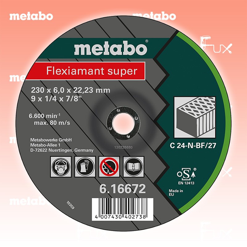 Das Ladenlokal bleibt vom 25. Dezember 2025 bis am 04. Januar 2026 geschlossen. Bestellungen und Lieferungen von Neugeräten werden trotz Ferienabwesenheit in gewohnter Fux-Manier entgegengenommen und ausgeliefert. Zu "Qualitätsklasse C 24-N Schruppscheiben" von Metabo Metabo Schruppscheibe Stein 150 mm Bestell- und Artikelnummer: 616654000 Spezialscheibe für Schrupparbeiten an Beton, Natur- und Kunststein Härte: weich Hohe Abtragsleistung bei hoher Standzeit Arbeitshöchstgeschwindigkeit 80 m/s Technische Daten Qualitätsklasse C 24 N Durchmesser x Dicke x Bohrung 150 x 6 x 22,23 mm Ausführung gekröpft Max. Drehzahl 10200 / min Standard-Ausrüstung Verkaufseinheit 25 Stk. Listenpreis CHF 175.00 Fuxpreis CHF 149.00 inkl. 8.1% MwSt, inkl vRG Frankolieferung Kein Grauimport! Produkt bestellen Verkaufseinheit 25 Stk. 1 Stück 2 Stück 3 Stück 4 Stück 5 Stück 6 Stück 7 Stück 8 Stück 9 Stück 10 Stück 11 Stück 12 Stück 13 Stück 14 Stück 15 Stück 16 Stück 17 Stück 18 Stück 19 Stück 20 Stück 21 Stück 22 Stück 23 Stück 24 Stück 25 Stück 26 Stück 27 Stück 28 Stück 29 Stück 30 Stück 31 Stück 32 Stück 33 Stück 34 Stück 35 Stück 36 Stück 37 Stück 38 Stück 39 Stück 40 Stück 41 Stück 42 Stück 43 Stück 44 Stück 45 Stück 46 Stück 47 Stück 48 Stück 49 Stück 50 Stück Alle Angaben ohne Gewähr und solange Vorrat reicht!Wiederverkäufer werden?Lehrlingsrabatt? Produkt als PDF AKTION 15%