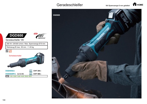 104DGD800DGD800ZJDGD800RTJ 2x 5.0 AhDGD800Ah Ah 1.5 / 2.0 / 3.0 / 4.0 / 5.0 / 6.0 Geradeschleifer HOMEGeradeschleifer 18V 350 W / 26%u2019000 U/min / Max. Spannzange %u00d8 8 mmWerkzeug %u00d8 max. 36 mm / 1.40 kgMit Spannzange 6 mm geliefertSchiebeschalterCHF 569.-CHF 285.-
