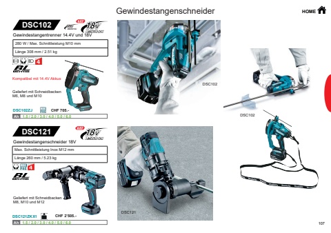 107DSC121DSC102DSC102ZJDSC121ZKX1DSC121DSC102DSC102Ah Ah 1.5 / 2.0 / 3.0 / 4.0 / 5.0 / 6.0 Ah Ah 1.5 / 2.0 / 3.0 / 4.0 / 5.0 / 6.0 Gewindestangenschneider HOMEGewindestangentrenner 14.4V und 18V Gewindestangenschneider 18V280 W / Max. Schnittleistung M10 mm L%u00e4nge 308 mm / 2.51 kg Kompatibel mit 14.4V AkkusMax. Schnittleistung Inox M12 mmL%u00e4nge 260 mm / 5.23 kg Geliefert mit SchneidbackenM8, M10 und M12Geliefert mit SchneidbackenM6, M8 und M10CHF 705.-CHF 2%u2019505.-