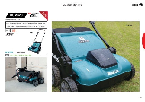 14130 LDUV320ZDUV320DUV320Ah Ah 1.5 / 2.0 / 3.0 / 4.0 / 5.0 / 6.0 Vertikutierer HOMEVertikutierer 18V410 W / Arbeitsbreite 32 cm / Arbeitstiefe -8 bis +4 mm3%u2019300 U/min / Autonomie avec 6.0 Ah : 128 m2 / 10.00 kgCHF 279.-