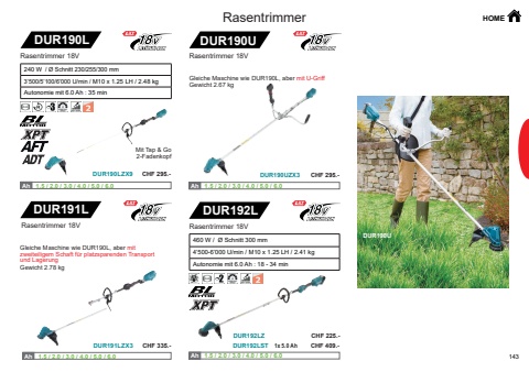 143DUR191LDUR191LZX3DUR190LDUR190LZX9DUR190UDUR190UZX3DUR192LDUR192LZDUR192LST 1x 5.0 AhAh Ah 1.5 / 2.0 / 3.0 / 4.0 / 5.0 / 6.0 Ah Ah 1.5 / 2.0 / 3.0 / 4.0 / 5.0 / 6.0 Ah Ah 1.5 / 2.0 / 3.0 / 4.0 / 5.0 / 6.0 Ah Ah 1.5 / 2.0 / 3.0 / 4.0 / 5.0 / 6.0 DUR190URasentrimmer HOMERasentrimmer 18VRasentrimmer 18V240 W / %u00d8 Schnitt 230/255/300 mm3%u2019500/5%u2019100/6%u2019000 U/min / M10 x 1.25 LH / 2.48 kgAutonomie mit 6.0 Ah : 35 minRasentrimmer 18V460 W / %u00d8 Schnitt 300 mm4%u2019500-6%u2019000 U/min / M10 x 1.25 LH / 2.41 kgAutonomie mit 6.0 Ah : 18 - 34 min Rasentrimmer 18VMit Tap & Go 2-FadenkopfGleiche Maschine wie DUR190L, aber mit U-Griff Gewicht 2.67 kgGleiche Maschine wie DUR190L, aber mit zweiteiligem Schaft f%u00fcr platzsparenden Transport und Lagerung Gewicht 2.78 kgCHF 335.-CHF 295.- CHF 295.-CHF 225.-CHF 409.-