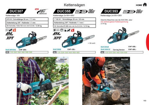153DUC307DUC307ZX2Ah Ah 1.5 / 2.0 / 3.0 / 4.0 / 5.0 / 6.0 DUC353DUC353CZDUC353ZDUC355DUC355Z= 30 cm3Ah Ah 1.5 / 2.0 / 3.0 / 4.0 / 5.0 / 6.0 Ah Ah 1.5 / 2.0 / 3.0 / 4.0 / 5.0 / 6.0 DUC307 DUC355HOMEKettens%u00e4ge 18V670 W / Schnittl%u00e4nge 30 cm / 7.7 m/sKettenteilung 3/8\80 Schnitte 100x100 mm mit 6.0 Ah / 3.30 kgKettens%u00e4genKettens%u00e4ge 2x18V=36V Kettens%u00e4ge 2x18V=36V1%u2019100 W / Schnittl%u00e4nge 35 cm / 20 m/sKettenteilung 3/8\50 Schnitte %u00d8 300 mm mit 2x 6.0 Ah / 3.72 kgCarving VersionGleiche Maschine wie die DUC355, aber mit werkzeugloser Kettenspannung3.74 kgCHF 289.- CHF 495.-CHF 409.-CHF 439.-
