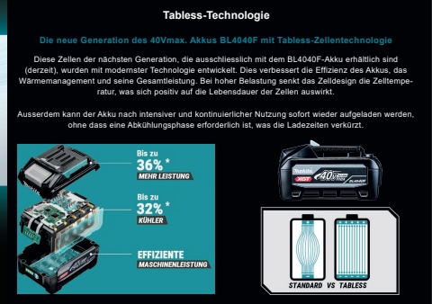 Tabless-TechnologieDiese Zellen der n%u00e4chsten Generation, die ausschliesslich mit dem BL4040F-Akku erh%u00e4ltlich sind (derzeit), wurden mit modernster Technologie entwickelt. Dies verbessert die Effizienz des Akkus, das W%u00e4rmemanagement und seine Gesamtleistung. Bei hoher Belastung senkt das Zelldesign die Zelltemperatur, was sich positiv auf die Lebensdauer der Zellen auswirkt. Ausserdem kann der Akku nach intensiver und kontinuierlicher Nutzung sofort wieder aufgeladen werden, ohne dass eine Abk%u00fchlungsphase erforderlich ist, was die Ladezeiten verk%u00fcrzt. Die neue Generation des 40Vmax. Akkus BL4040F mit Tabless-Zellentechnologie