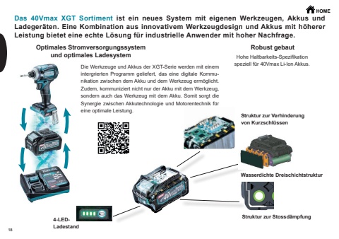 HOME18Die Werkzeuge und Akkus der XGT-Serie werden mit einem intergrierten Programm geliefert, das eine digitale Kommunikation zwischen dem Akku und dem Werkzeug erm%u00f6glicht. Zudem, kommuniziert nicht nur der Akku mit dem Werkzeug, sondern auch das Werkzeug mit dem Akku. Somit sorgt die Synergie zwischen Akkutechnologie und Motorentechnik f%u00fcr eine optimale Leistung.Das 40Vmax XGT Sortiment ist ein neues System mit eigenen Werkzeugen, Akkus und Ladeger%u00e4ten. Eine Kombination aus innovativem Werkzeugdesign und Akkus mit h%u00f6herer Leistung bietet eine echte L%u00f6sung f%u00fcr industrielle Anwender mit hoher Nachfrage.Optimales Stromversorgungssystemund optimales LadesystemRobust gebautHohe Haltbarkeits-Spezifikation speziell f%u00fcr 40Vmax Li-Ion Akkus.Struktur zur Verhinderung von Kurzschl%u00fcssenWasserdichte DreischichtstrukturStruktur zur Stossd%u00e4mpfung 4-LEDLadestand
