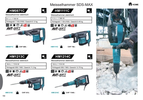182HM0871CHM0871CHM1111CHM1213CHM1111CHM1213CHM1214CHM1214CHM1214CCHF 609.- CHF 759.-CHF 815.- CHF 1%u2019049.-Meisselhammer SDS-MAX HOMEMeisselhammer elektrisch8.1 J / 1%u2019100 W Schlagzahl 1%u2019100-2%u2019650 / Gewicht 6.12 kgMeisselhammer elektrisch11.2 J / 1%u2019300 W Schlagzahl 1%u2019100-2%u2019650 / Gewicht 8.46 kgMeisselhammer elektrisch18.6 J / 1%u2019510 W Schlagzahl 950-1%u2019900 / Gewicht 11.2 kgMeisselhammer elektrisch19.9 J / 1%u2019510 WSchlagzahl 950-1%u2019900 / Gewicht 12.75 kg