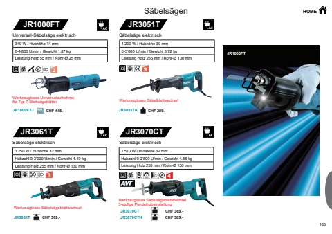 185JR1000FTJR1000FTJJR3051TJR3061TJR3051TKJR3061T JR3070CTHJR3070CTJR3070CTJR1000FTCHF 445.- CHF 209.-CHF 309.- CHF 389.-CHF 369.-HOME340 W / Hubh%u00f6he 14 mm 0-4%u2019800 U/min / Gewicht 1.87 kgLeistung Holz 55 mm / Rohr-%u00d8 25 mm Universal-S%u00e4bels%u00e4ge elektrischWerkzeugloses Universalaufnahme f%u00fcr Typ-T Stichs%u00e4gebl%u00e4tter Werkzeugloses S%u00e4belblattwechsel1%u2019200 W / Hubh%u00f6he 30 mm0-3%u2019000 U/min / Gewicht 3.72 kgLeistung Holz 255 mm / Rohr-%u00d8 130 mm S%u00e4bels%u00e4ge elektrischWerkzeugloses S%u00e4bels%u00e4geblattwechsel1%u2019250 W / Hubh%u00f6he 32 mmHubzahl 0-3%u2019000 U/min / Gewicht 4.19 kgLeistung Holz 255 mm / Rohr-%u00d8 130 mmS%u00e4bels%u00e4ge elektrischWerkzeugloses S%u00e4bels%u00e4geblattwechsel3-stufige Pendelhubeinstellung1%u2019510 W / Hubh%u00f6he 32 mmHubzahl 0-2%u2019800 U/min / Gewicht 4.86 kgLeistung Holz 255 mm / Rohr-%u00d8 130 mm S%u00e4bels%u00e4ge elektrischS%u00e4bels%u00e4gen