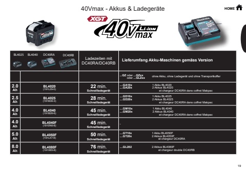 HOME19Ladezeiten mit DC40RA/DC40RB Lieferumfang Akku-Maschinen gem%u00e4ss Version...GZ oder ...GZxx ohne Akku, ohne Ladeger%u00e4t und ohne Transportkoffer oder ...GLZxx2.0 AhBL4020(191L29-0) 22 min.Schnellladeger%u00e4t....GA10x 1 Akku BL4020....GA20x 2 Akkus BL4020 et chargeur DC40RA dans coffret Makpac2.5AhBL4025(191B36-3) 28 min.Schnellladeger%u00e4t....GD10x 1 Akku BL4025....GD20x 2 Akkus BL4025 et chargeur DC40RA dans coffret Makpac 4.0AhBL4040(191B26-6) 45 min.Schnellladeger%u00e4t....GM10x 1 Akku BL4040....GM20x 2 Akkus BL4040 et chargeur DC40RA dans coffret Makpac 4.0AhBL4040F(1910N6-8) 45 min.Schnellladeger%u00e4t-5.0AhBL4050F(191L47-8) 50 min.Schnellladeger%u00e4t....GT10x 1 Akku BL4050F....GT20x 2 Akkus BL4050F et chargeur DC40RA 8.0AhBL4080F(191X65-8) 76 min.Schnellladeger%u00e4t....GL202 2 Akkus BL4080F et chargeur double DC40RB BL4025 BL4040 DC40RA DC40RB40Vmax - Akkus & Ladeger%u00e4teWasserdichte DreischichtstrukturStruktur zur Stossd%u00e4mpfung