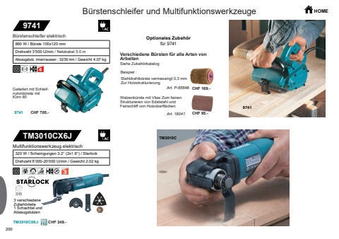 200974197419741Art. P-65648Art. 18041TM3010CX6JTM3010CX6JTM3010CCHF 705.-CHF 169.-CHF 95.-CHF 249.-B%u00fcrstenschleifer und Multifunktionswerkzeuge HOMEB%u00fcrstenschleifer elektrisch 860 W / B%u00fcrste 100x120 mm Drehzahl 3%u2019500 U/min / Netzkabel 5.0 mAbsaugstutz. innen/aussen : 32/38 mm / Gewicht 4.07 kgGeliefert mit Schleifnylonb%u00fcrste mit Korn 80Optionales Zubeh%u00f6rf%u00fcr 9741Verschiedene B%u00fcrsten f%u00fcr alle Arten von Arbeiten Siehe Zubeh%u00f6rkatalogBeispiel :Stahldrahtb%u00fcrste vermessingt 0,3 mm Zur HolzstrukturierungWalzenb%u00fcrste mit Vlies Zum feinen Strukturieren von Edelstahl und Feinschliff von Holzoberfl%u00e4chen320 W / Schwingungen 3.2%u00b0 (2x1.6%u00b0) / StarlockDrehzahl 6%u2019000-20%u2019000 U/min / Gewicht 2.02 kg Multifunktionswerkzeug elektrisch3 verschiedene Zubeh%u00f6rteile1 Schachtel und Absaugstutzen