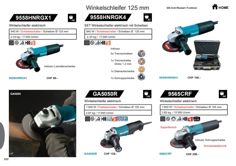 2029558HNRGX1 9558HNRGK49558HNRGX1GA5050RGA5050R9565CRF9565CRF9558HNRGK4GA5050CHF 99.- CHF 149.-CHF 139.- CHF 259.-HOMEInklusiv5x Trennscheiben1x Trennscheibe Dicke 1.2 mm1x Diamantscheibe1x SchruppscheibeSET Winkelschleifer elektrisch mit Scheiben840 W / Schiebeschalter / Scheiben %u00d8 125 mm 2.33 kg / 11%u2019000 U/minWinkelschleifer 125 mm840 W / Schiebeschalter / Scheiben %u00d8 125 mm2.33 kg / 11%u2019000 U/minWinkelschleifer elektrisch Inklusiv LamellenscheibeWinkelschleifer elektrisch1%u2019300 W / Paddelschalter / Scheiben %u00d8 125 mm2.97 kg / 11%u2019000 U/minWinkelschleifer elektrischInklusiv Schruppscheibe1%u2019400 W / Schiebeschalter / Scheiben %u00d8 125 mm2.85 kg / 12%u2019000 U/minSuperflanschMit Anti-Restart FunktionKonstantelektronik