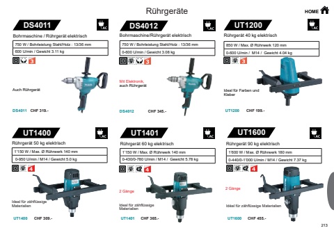 213UT1200UT1200UT1400 UT1401UT1400 UT1401UT1600UT1600DS4012DS4012DS4011DS4011 CHF 199.-CHF 309.- CHF 365.- CHF 455.-CHF 319.- CHF 345.-HOMER%u00fchrger%u00e4t 40 kg elektrisch850 W / Max. %u00d8 R%u00fchrwerk 120 mm 0-600 U/min / M14 / Gewicht 4.04 kg Ideal f%u00fcr Farben undKleberR%u00fchrger%u00e4t 50 kg elektrisch1%u2019150 W / Max. %u00d8 R%u00fchrwerk 140 mm 0-950 U/min / M14 / Gewicht 5.0 kg R%u00fchrger%u00e4te2 G%u00e4ngeIdeal f%u00fcr z%u00e4hfl%u00fcssigeMaterialienR%u00fchrger%u00e4t 90 kg elektrisch1%u2019600 W / Max. %u00d8 R%u00fchrwerk 180 mm 0-440/0-1%u2019000 U/min / M14 / Gewicht 7.37 kg 2 G%u00e4ngeId%u00e9al f%u00fcr z%u00e4hfl%u00fcssige MaterialienIdeal f%u00fcr z%u00e4hfl%u00fcssigeMaterialienR%u00fchrger%u00e4t 60 kg elektrisch1%u2019150 W / Max. %u00d8 R%u00fchrwerk 140 mm0-430/0-780 U/min / M14 / Gewicht 5.78 kg Bohrmaschine/R%u00fchrger%u00e4t elektrisch750 W / Bohrleistung Stahl/Holz : 13/36 mm 0-600 U/min / Gewicht 3.08 kg Mit Elektronik, auch R%u00fchrger%u00e4t750 W / Bohrleistung Stahl/Holz : 13/36 mm 600 U/min / Gewicht 3.11 kg Bohrmaschine / R%u00fchrger%u00e4t elektrischAuch R%u00fchrger%u00e4t