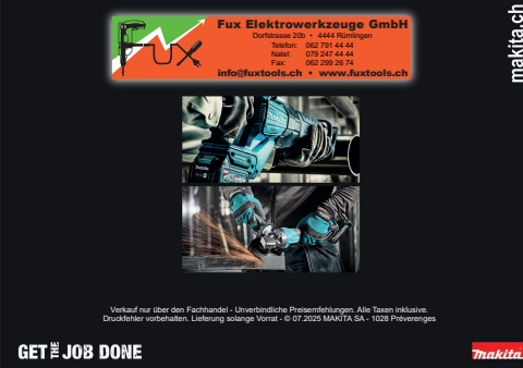 227Verkauf nur %u00fcber den Fachhandel - Unverbindliche Preisemfehlungen. Alle Taxen inklusive. Druckfehler vorbehalten. Lieferung solange Vorrat - %u00a9 07.2025 MAKITA SA - 1028 Pr%u00e9verengesFux Elektrowerkzeuge GmbHinfo@fuxtools.ch %u2022 www.fuxtools.chDorfstrasse 20b %u2022 4444 R%u00fcmlingen062 791 44 44079 247 44 44062 299 26 74Telefon:Natel:Fax: