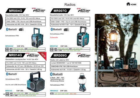 HOME46MR004GMR007GZMR004G MR007GMR004GZMR014GMR014GAh Ah 40V 2.0 / 2.5 / 4.0 12V 1.5 / 2.0 / 4.0Ah Ah 18V + 14.4V 1.5 / 3.0 / 4.0 / 5.0 / 6.0 Ah Ah 40V 2.0 / 2.5 / 4.0 12V 1.5 / 2.0 / 4.0Ah Ah 18V + 14V 1.5 / 3.0 / 4.0 / 5.0 / 6.0 Ah Ah 40V 2.0 / 2.5 / 4.0 12V 1.5 / 2.0 / 4.0Ah Ah 18V + 14V 1.5 / 3.0 / 4.0 / 5.0 / 6.0 MR009GMR009GZAh Ah 2.0 / 2.5 / 4.0 / 4.0F / 5.0 / 8.0 MR009GBaustellenradio 12V bis 40VF%u00fcr 230V und 12V, 14.4V,18V und 40V AkkusDAB / DAB+ / FM / Aux-In und USB Anschl%u00fcsseAutonomie mit 40V 4 Ah : 19 h / Gewicht 5.26 kgF%u00fcr 230V und 12V, 14.4V, 18V und 40V AkkusDAB / DAB+ / FM / Aux-In und USB Anschl%u00fcsseAutonomie mit 40V 4 Ah : 30 h / Gewicht 4.23 kgBaustellenradio 12V bis 40VRadiosSchutzklasse IP65SubwooferSchutzklasse IP65Baustellen-Lautsprecher 14.4V bis 40VSchutzklasse IP65F%u00fcr 230V und 14.4V, 18V und 40V AkkusSubwoofer de 127 mm / Mit Mikrofon / 20 W mit 18VAutonomie mit 40V 4 Ah : 32 h / Gewicht 3.80 kgAux-In und USB Anschl%u00fcsseRadio mit Laterne 40VLumen 95/200/300 / Lux lx* 55/140/1000DAB/DAB+/FM / Mit USB-AnschlussAutonomie mit 4 Ah : 14-36 h / Gewicht 1.02 kg4 Modi : 360%u00b0, 180%u00b0, Taschenlampe und Stroboscop-Modus Schutzklasse IP65CHF 279.- CHF 325.-CHF 289.- CHF 229.-