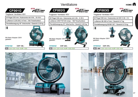 HOME47CF001GCF001GZCF002GCF002GZCF003GCF003GZAh Ah 2.0 / 2.5 / 4.0 / 4.0F / 5.0 Ah Ah 2.0 / 2.5 / 4.0 / 4.0F / 5.0 / 8.0 Ah Ah 40V 2.0 / 2.5 / 4.0 / 4.0F / 5.0 / 8.0 CF001GCF003GTragbarer Ventilator 40V%u00d8 Fl%u00fcgel 235 mm / Autonomie mit 4 Ah : 10-18 hLuftstrom 5.2/6.5/8.2 m3/min / Mit TimerfunktionPendelbewegung 45%u00b0 links/rechts / Gewicht 2.03 kgTragbarer Ventilator 40V%u00d8 Fl%u00fcgel 330 mm / Autonomie mit 4 Ah : 5-16 hLuftstrom 240/170/120 m/sec / Mit TimerfunktionPendelbewegung 45%u00b0 links/rechts / Gewicht 3.62 kgVentilatore%u00d8 Fl%u00fcgel 450 mm / Autonomie mit 40V 4 Ah : 2 hLuftstrom 96-300 m3/min / Gewicht 9.7 kgPendelbewegung 60/90/120%u00b0 / Gewicht 9.70 kgTragbarer Ventilator 40VMit Netz-Adapter 230Vgeliefert Mit Netz-Adapter 230VgeliefertMit Netz-Adapter 230VgeliefertCHF 155.- CHF 225.- CHF 479.-