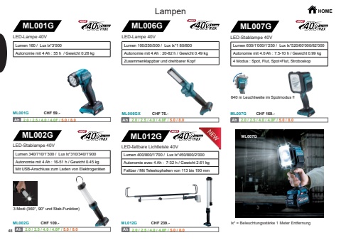 HOME48ML001GML001GML002GML002GML006GML006GXML007GML007GML012GML012GAh Ah 2.0 / 2.5 / 4.0 / 4.0F / 5.0 / 8.0 Ah Ah 2.0 / 2.5 / 4.0 / 4.0F / 5.0 / 8.0 Ah Ah 2.0 / 2.5 / 4.0 / 4.0F / 5.0 / 8.0 Ah Ah 2.0 / 2.5 / 4.0 / 4.0F / 5.0 / 8.0 Ah Ah 2.0 / 2.5 / 4.0 / 4.0F / 5.0 / 8.0 ML007GLED-Lampe 40VLumen 160 / Lux lx*3%u2019000Autonomie mit 4 Ah : 55 h / Gewicht 0.28 kgLampenLED-Stablampe 40VLumen 340/710/1%u2019300 / Lux lx*310/340/1%u2019900 Autonomie mit 4 Ah : 16-51 h / Gewicht 0.45 kgMit USB-Anschluss zum Laden von Elektroger%u00e4tenLumen 100/250/500 / Lux lx*1 80/800 Autonomie mit 4 Ah : 20-82 h / Gewicht 0.49 kgZusammenklappbar und drehbarer KopfLED-Lampe 40VLumen 600/1%u2019000/1%u2019250 / Lux lx*520/60%u2019000/82%u2019000 Autonomie mit 4.0 Ah : 7.5-10 h / Gewicht 0.99 kg4 Modus : Spot, Flut, Spot+Flut, StroboskopLED-Stablampe 40VLED-faltbare Lichtleiste 40VLumen 400/800/1%u2019700 / Lux lx*450/800/2%u2019000 Autonomie avec 4 Ah : 7-32 h / Gewicht 2.61 kgFaltbar / Mit Teleskophaken von 113 bis 190 mmlx* = Beleuchtungsst%u00e4rke 1 Meter Entfernung3 Modi (360%u00b0, 90%u00b0 und Stab-Funktion) 640 m Leuchtweite im Spotmodus !!CHF 59.-CHF 109.-CHF 75.- CHF 169.-CHF 239.-