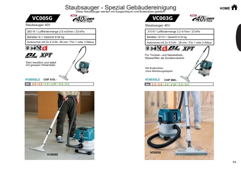 HOME53VC005G VC003GVC005GLZ VC003GLZVC005GAh Ah 2.0 / 2.5 / 4.0 / 4.0F / 5.0 / 8.0 Ah Ah 2.0 / 2.5 / 4.0 / 4.0F / 5.0 / 8.0 VC003GStaubsauger - Spezial Geb%u00e4udereinigung 310 W / Luftf%u00f6rdermenge 3.2 m3/min / 23 kPa Beh%u00e4lter 12/15 l / Gewicht 9.33 kg Autonomie mit 2x 5.0 Ah : 28 min / F%u00fcr 1 oder 2 Akkus Sehr handlich und stabilmit grossen Hinterr%u00e4der265 W / Luftf%u00f6rdermenge 2.8 m3/min / 23 kPa Beh%u00e4lter 8 l / Gewicht 8.94 kg Autonomie mit 2x 5.0 Ah: 28 min / F%u00fcr 1 oder 2 Akkus Staubsauger 40V Staubsauger 40VMit Bodend%u00fcse ohne WerkzeugadapterF%u00fcr Trocken- und Nassbetrieb. Wasserfilter als Sonderzubeh%u00f6rDiese Staubsauger werden mit Saugschlauch und Bodend%u00fcse geliefert.CHF 619.- CHF 669.-