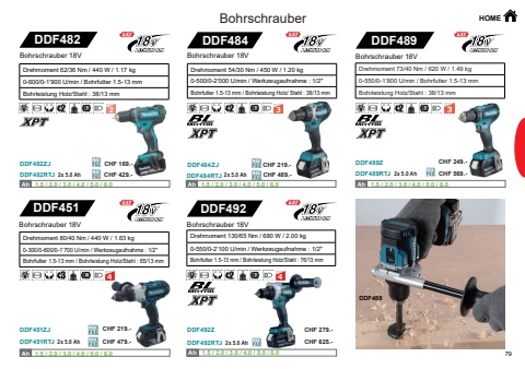 79DDF484DDF484ZJDDF484RTJ 2x 5.0 AhDDF451DDF451ZJDDF451RTJ 2x 5.0 AhDDF492DDF492ZDDF492RTJ 2x 5.0 AhDDF482DDF482ZJDDF482RTJ 2x 5.0 AhDDF489DDF489DDF489ZDDF489RTJ 2x 5.0 AhAh Ah 1.5 / 2.0 / 3.0 / 4.0 / 5.0 / 6.0 Ah Ah 1.5 / 2.0 / 3.0 / 4.0 / 5.0 / 6.0 Ah Ah 1.5 / 2.0 / 3.0 / 4.0 / 5.0 / 6.0 Ah Ah 1.5 / 2.0 / 3.0 / 4.0 / 5.0 / 6.0 Ah Ah 1.5 / 2.0 / 3.0 / 4.0 / 5.0 / 6.0 Bohrschrauber HOMEBohrschrauber 18VDrehmoment 62/36 Nm / 440 W / 1.17 kg0-600/0-1%u2019900 U/min / Bohrfutter 1.5-13 mmBohrleistung Holz/Stahl : 38/13 mm Bohrschrauber 18VDrehmoment 54/30 Nm / 450 W / 1.20 kg0-500/0-2%u2019000 U/min / Werkzeugaufnahme : 1/2\Bohrfutter 1.5-13 mm / Bohrleistung Holz/ Stahl : 38/13 mmBohrschrauber 18VDrehmoment 73/40 Nm / 620 W / 1.49 kg0-550/0-1%u2019800 U/min / Bohrfutter 1.5-13 mmBohrleistung Holz/Stahl : 38/13 mmBohrschrauber 18VDrehmoment 80/40 Nm / 440 W / 1.63 kg0-300/0-600/0-1%u2019700 U/min / Werkzeugaufnahme : 1/2\Bohrfutter 1.5-13 mm / Bohrleistung Holz/Stahl : 65/13 mm Bohrschrauber 18VDrehmoment 130/65 Nm / 680 W / 2.00 kg0-550/0-2%u2019100 U/min / Werkzeugaufnahme : 1/2\Bohrfutter 1.5-13 mm / Bohrleistung Holz/Stahl : 76/13 mmCHF 429.-CHF 169.-CHF 489.-CHF 219.-CHF 569.-CHF 249.-CHF 479.-CHF 219.-CHF 625.-CHF 279.-