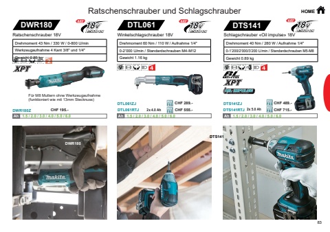 83DTS141RTJ 2x 5.0 AhDTS141DTL061ZJDTL061RTJ 2x 4.0 AhDTL061DTS141ZJAh Ah 1.5 / 2.0 / 3.0 / 4.0 / 5.0 / 6.0 Ah Ah 1.5 / 2.0 / 3.0 / 4.0 / 5.0 / 6.0 DTS141DWR180ZDWR180Ah Ah 1.5 / 2.0 / 3.0 / 4.0 / 5.0 / 6.0 DWR180Ratschenschrauber und Schlagschrauber HOMEWinkelschlagschrauber 18V Schlagschrauber %u00abOil impulse%u00bb 18VDrehmoment 60 Nm / 110 W / Aufnahme 1/4\0-2%u2019000 U/min / Standardschrauben M4-M12Gewicht 1.16 kgDrehmoment 40 Nm / 280 W / Aufnahme 1/4\0-1%u2019200/2%u2019000/3%u2019200 U/min / Standardschrauben M5-M8Gewicht 0.89 kgDrehmoment 43 Nm / 330 W / 0-800 U/min Werkzeugaufnahme 4 Kant 3/8\Gewicht 0.88 kgRatschenschrauber 18VF%u00fcr M8 Muttern ohne Werkzeugaufnahme (funktioniert wie mit 13mm Stecknuss)CHF 289.-CHF 555.- CHF 715.-CHF 489.-CHF 195.-