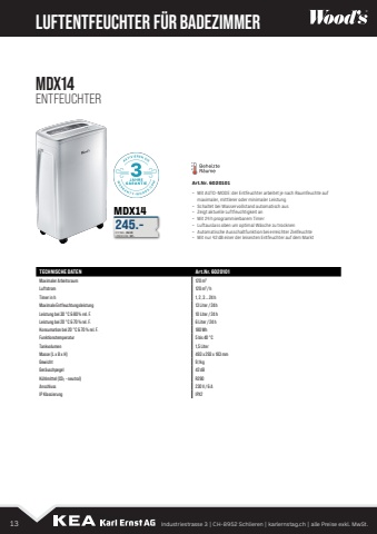 LUFTENTFEUCHTER F%u00dcR BADEZIMMERArt.Nr. 6020101%u2013 Mit AUTO-MODE: der Entfeuchter arbeitet je nach Raumfeuchte auf maximaler, mittlerer oder minimaler Leistung%u2013 Schaltet bei Wasservollstand automatisch aus%u2013 Zeigt aktuelle Luftfeuchtigkeit an%u2013 Mit 24 h programmierbarem Timer%u2013 Luftauslass oben um optimal W%u00e4sche zu trocknen%u2013 Automatische Ausschaltfunktion bei erreichter Zielfeuchte%u2013 Mit nur 42 dB einer der leisesten Entfeuchter auf dem MarktMDX14MDX14ENTFEUCHTERTECHNISCHE DATEN Art.Nr. 6020101Maximaler Arbeitsraum 120 m%u00b3Luftstrom 120 m%u00b3/hTimer in h 1, 2, 3 %u2026 24hMaximale Entfeuchtungsleistung 13 Liter/24hLeistung bei 30 %u00b0C & 80% rel. F. 10 Liter/24hLeistung bei 20 %u00b0C & 70% rel. F. 6 Liter/24hKonsumation bei 20 %u00b0C & 70% rel. F. 180 WhFunktionstemperatur 5bis40 %u00b0CTankvolumen 1,5 LiterMasse (L x B x H) 493 x 293 x 183 mmGewicht 9,1kgGer%u00e4uschpegel 42dBK%u00fchlmittel (CO%u2082 %u2013 neutral) R290Anschluss 230 V/6 AIP Klassierung IPX2245.-DTP INKL. 264.85LPREIS EXKL. 307.%u201313 Industriestrasse 3 | CH-8952 Schlieren | karlernstag.ch | alle Preise exkl. MwSt.